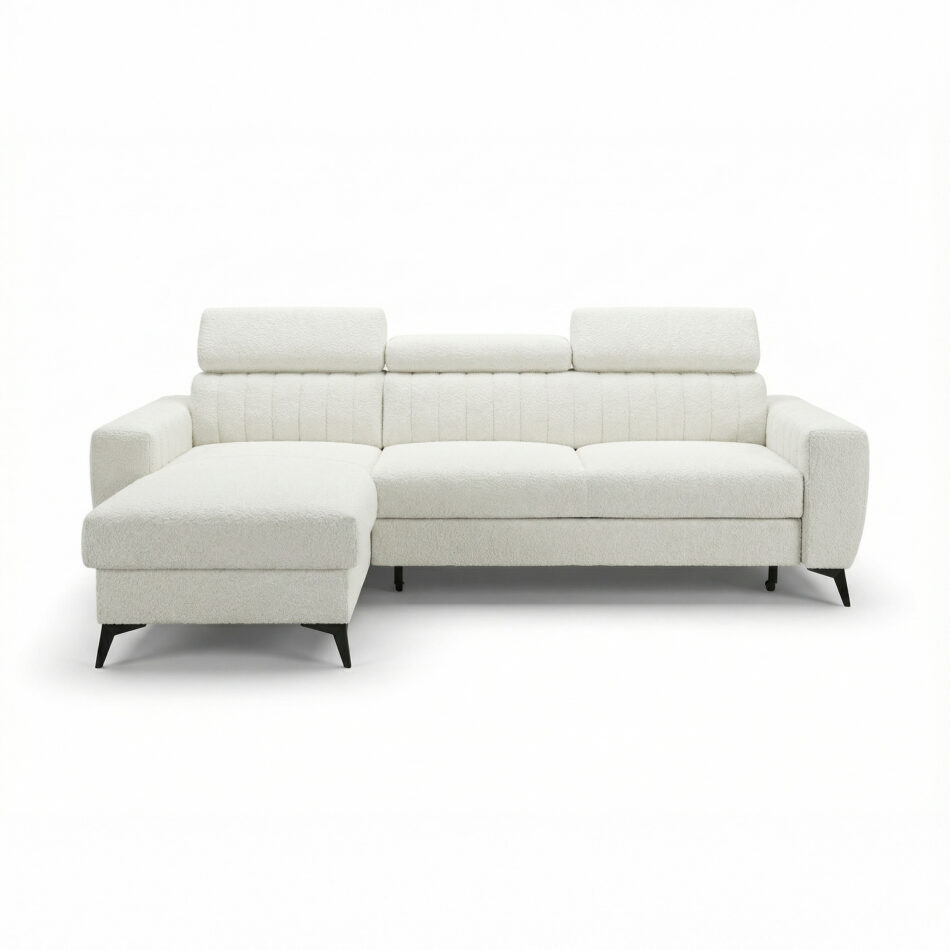 Siedzisko narożnika wykonano ze sprężyny falistej i pianki T30, co gwarantuje wygodę siedzenia i leżenia. Regulowane zagłówki i modne przeszycia pozwalają dopasować narożnik do Twoich potrzeb i nadają mu eleganckiego charakteru.