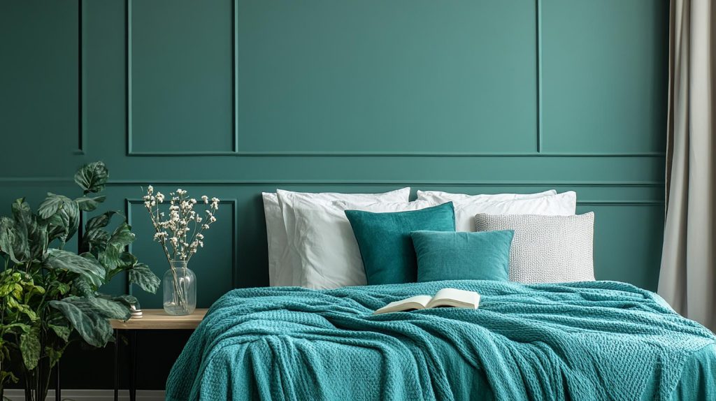Ciemne kolory mebli i turkus na ścianach może się kojarzyć z latami 90., co nie oznacza, że taka aranżacja będzie teraz passe. Niebieski kolor połączony z zielenią ma w sobie mnóstwo energii. To idealny kolor dla osób, które zastanawiają się, jaki kolor ścian wybrać, aby nie przyćmić całego pomieszczenia. Neutralne kolory zarówno z palety ciepłej, jak i chłodniej sprawdzą się w połączeniu z turkusem.