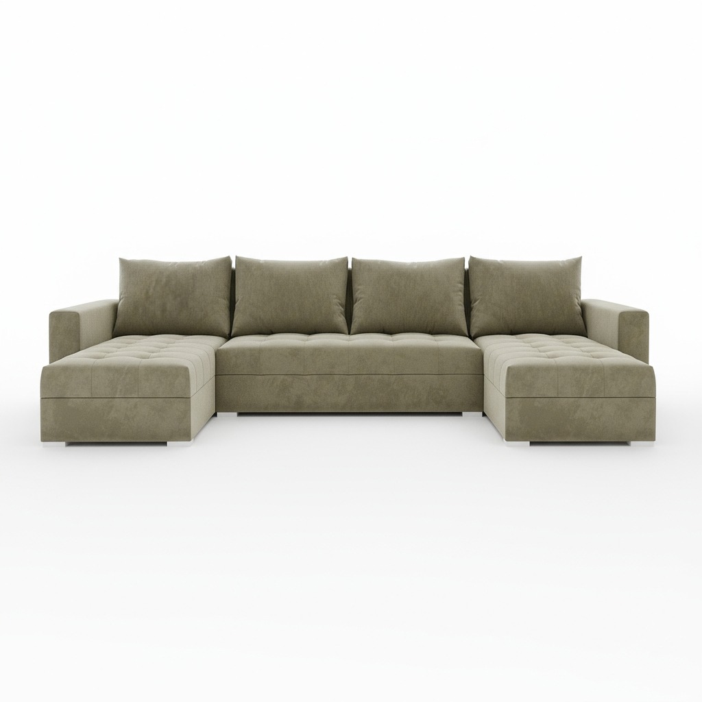 Jego rozłożysty kształt w literę U naturalnie tworzy centrum domowego życia. Zaprasza do współnego spędzania czasu w większym gronie. Ciepły, beżowy odcień welurowej tkaniny Manila wnosi do wnętrza spokój i subtelną elegancję. Dlatego mebel doskonale odnajduje się zarówno w aranżacjach klasycznych, jak i nowoczesnych. Co ważne, tapicerowany tył pozwala ustawić go w dowolnym miejscu, nawet na środku pokoju. Niskie, chromowane nóżki dodają całej bryle lekkości i stanowią dyskretny, stylowy akcent.