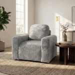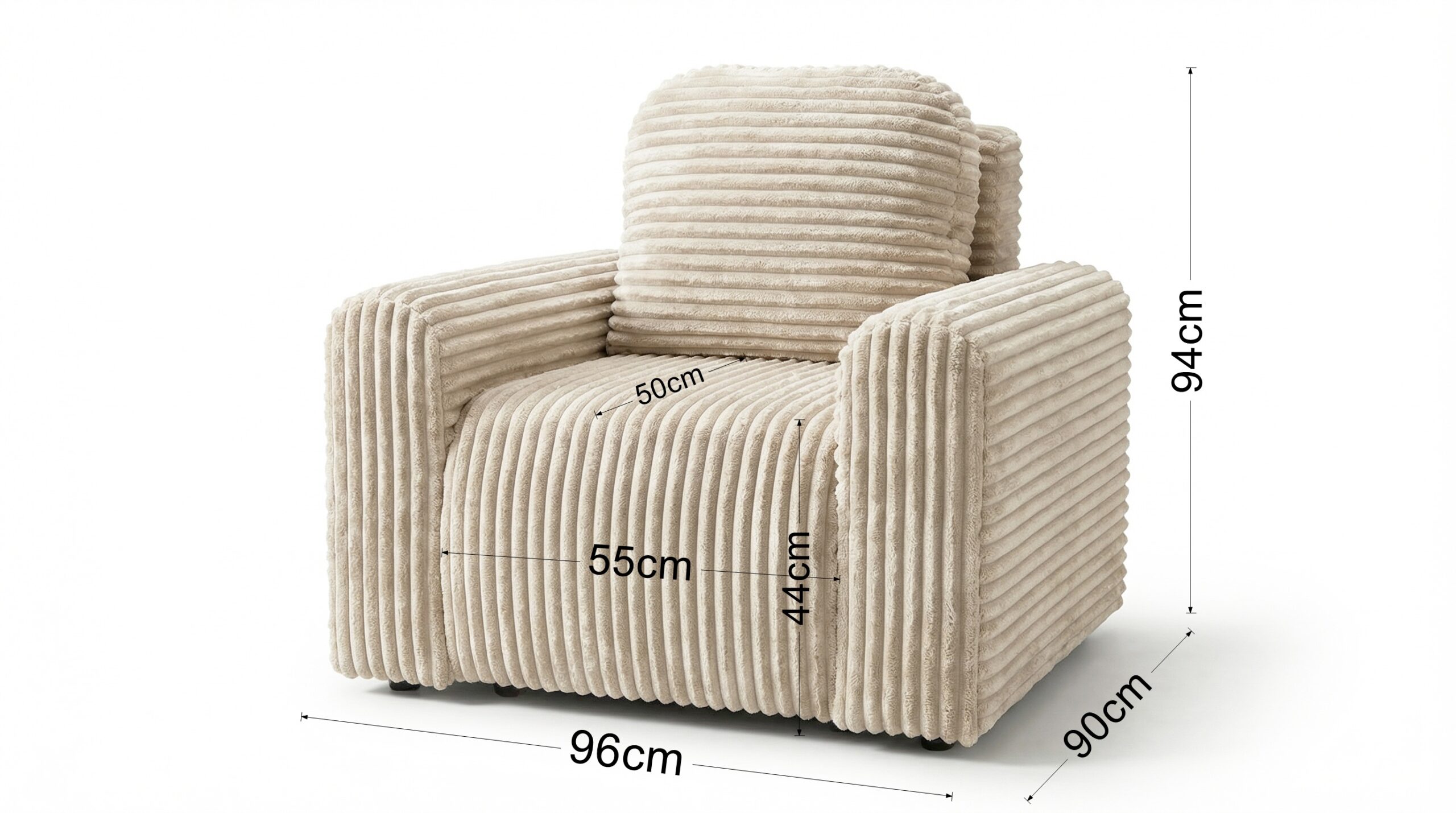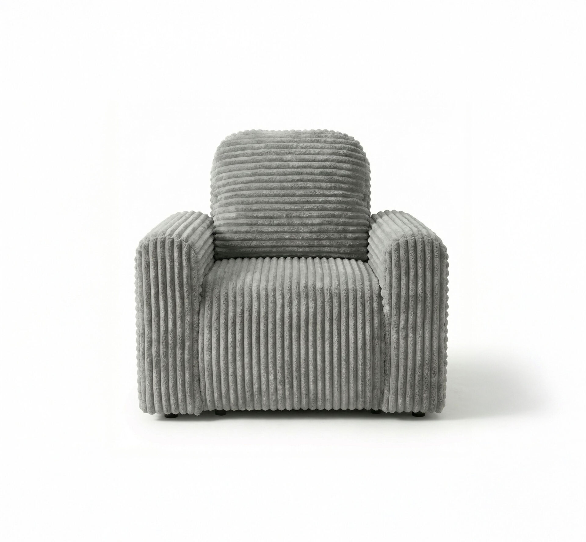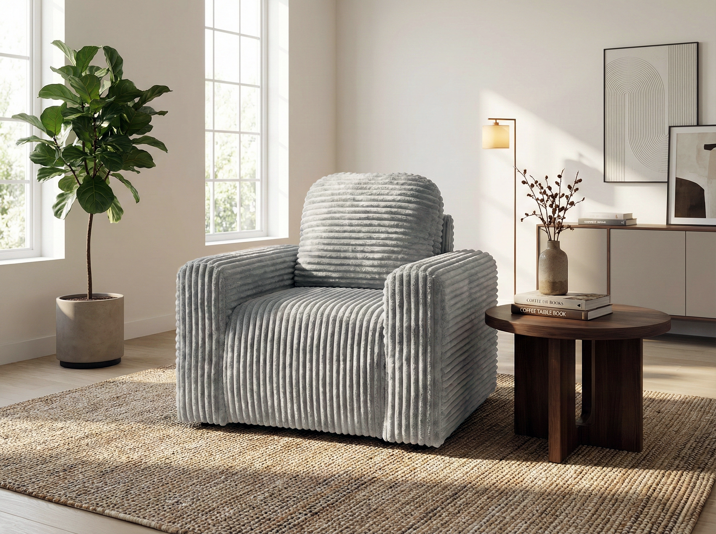 Tapicerowany miękką tkaniną o wyraźnej, sztruksowej strukturze, fotel zachwyca przyjemną w dotyku fakturą i estetycznym wykończeniem. Obszerne siedzisko oraz szerokie podłokietniki zapewniają stabilne podparcie i wysoki komfort użytkowania, idealny do codziennego relaksu.