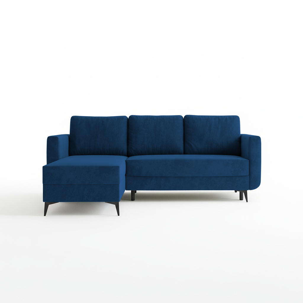 Mebel jest niezwykle praktyczny w codziennym użytkowaniu. Posiada intuicyjną funkcję spania typu DL. Dzięki niej można szybko przygotować wygodne miejsce do spania dla gości. Duży pojemnik na pościel pomaga z kolei utrzymać porządek w salonie. Można w nim schować dodatkowe koce, poduszki czy inne tekstylia. Granatowy narożnik Jord został pokryty tkaniną przyjazną zwierzętom oraz ułatwiającą czyszczenie. Jej hydrofobowa powłoka utrudnia wchłanianie rozlanych płynów. To sprawia, że sofa jest idealnym wyborem dla rodzin z dziećmi i właścicieli czworonogów.