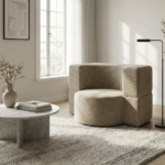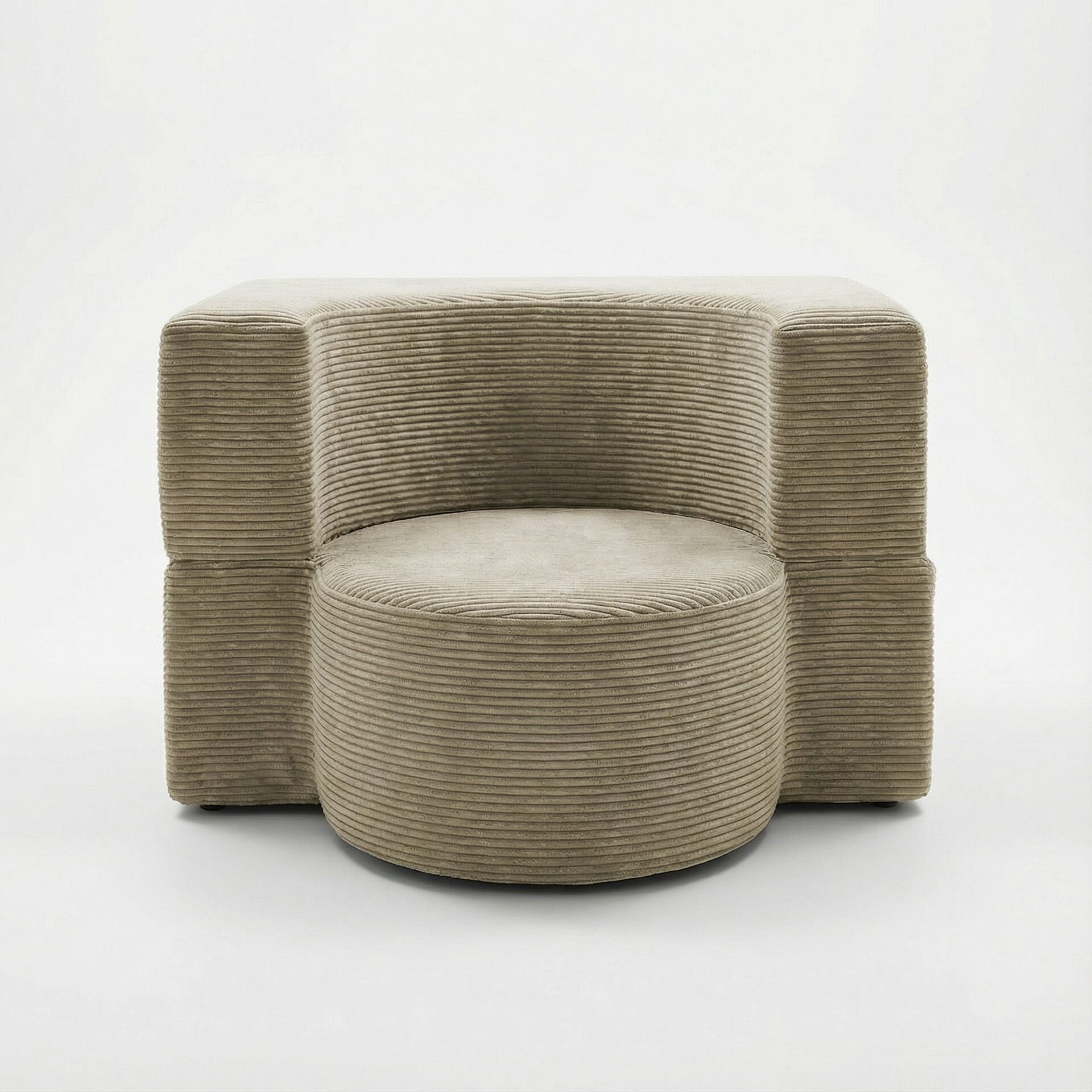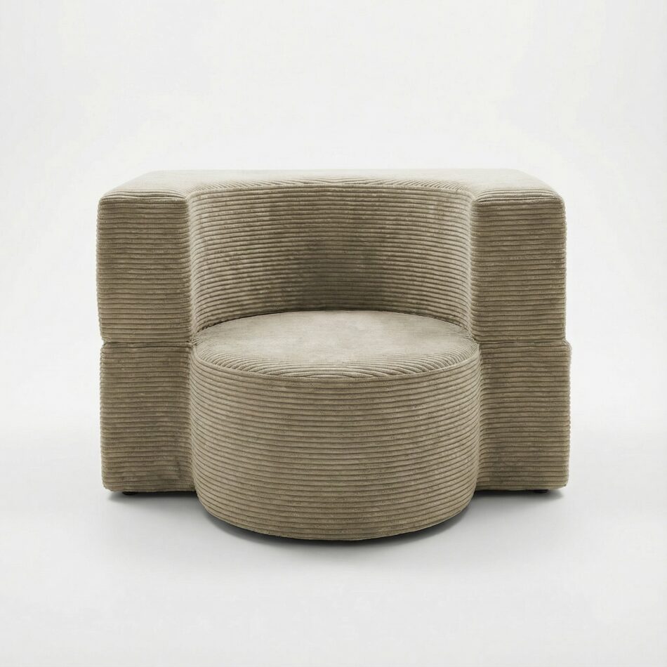 Fotel piankowy Arc to nowoczesna bryła o rzeźbiarskim charakterze, która łączy minimalistyczny design z wyjątkową wygodą. Jego obłe kształty zostały podkreślone grubą, mięsistą tkaniną sztruksową, która nadaje wnętrzu przytulności i szlachetnego wyrazu. Dzięki swojej formie fotel nie tylko stanowi wygodne miejsce do odpoczynku, ale jest też wyrazistym elementem dekoracyjnym.