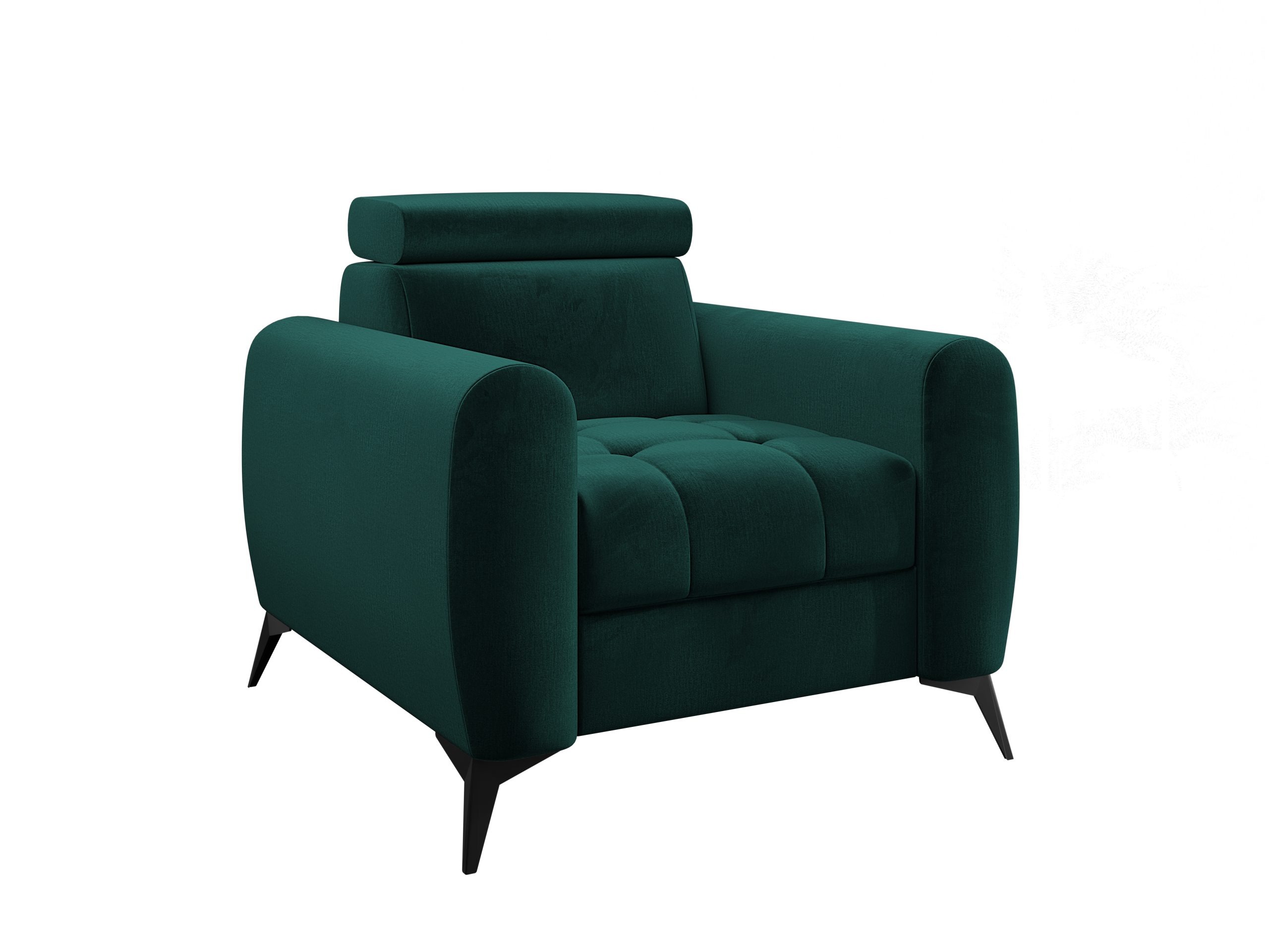 Oto fotel Bjorn otulony welurem w głębokim odcieniu butelkowej zieleni.