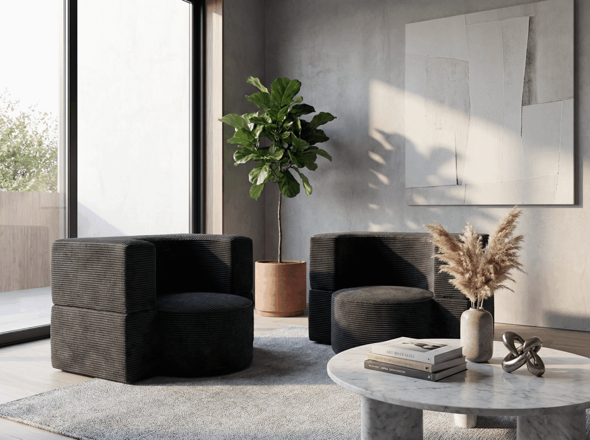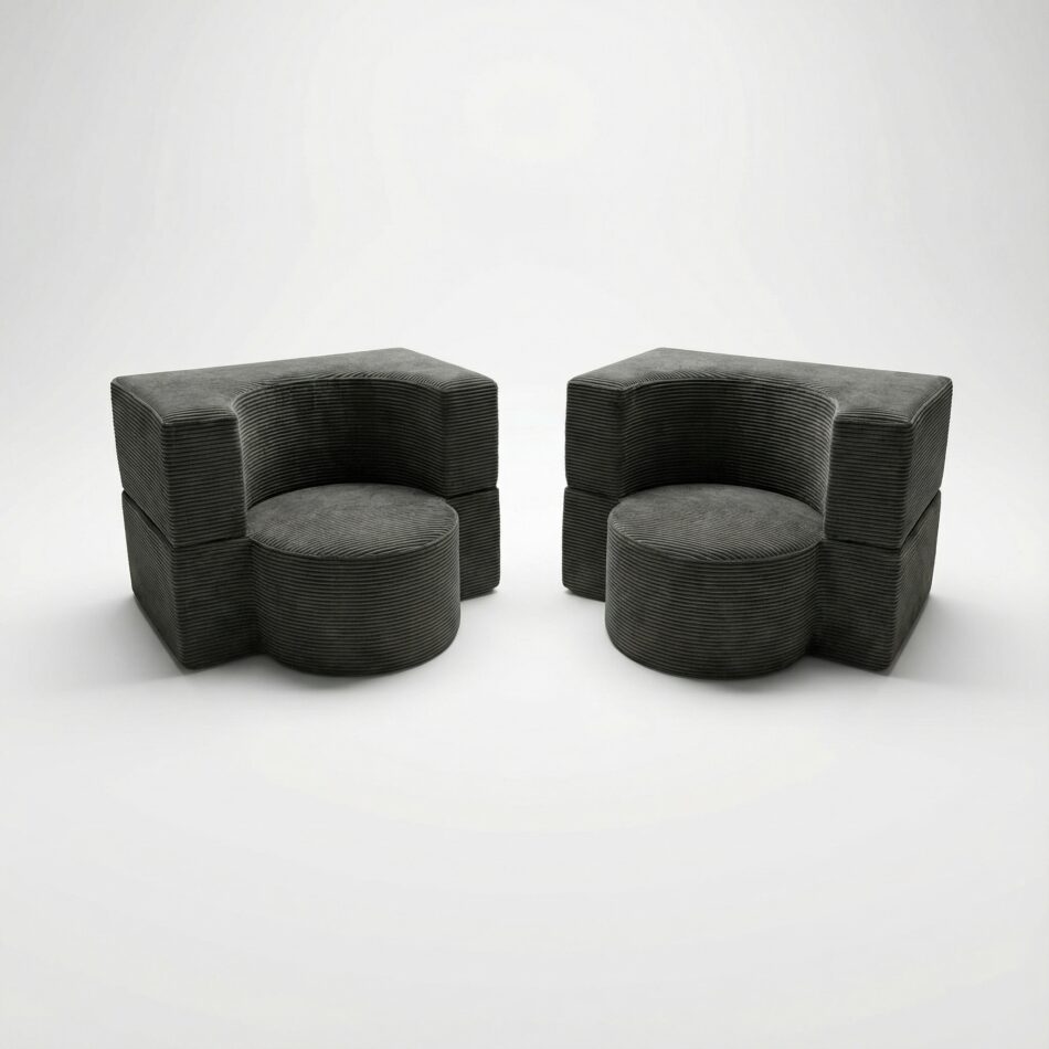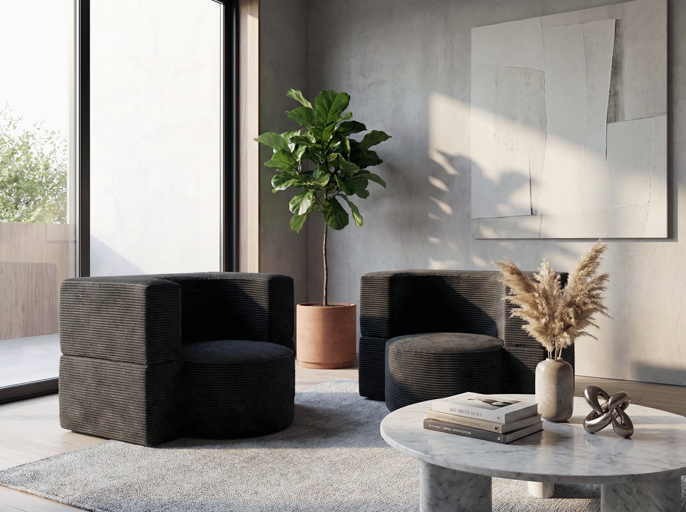 Zestaw foteli Arc to innowacyjne rozwiązanie, które łączy rzeźbiarski design z nieoczekiwaną funkcjonalnością. Dwa niezależne moduły o obłych kształtach tworzą stylową i niezwykle wygodną strefę wypoczynkową, idealną do salonu czy pokoju gościnnego. Całość została wykończona wysokiej jakości tkaniną sztruksową, której wyrazista struktura dodaje wnętrzu przytulności oraz szlachetnego charakteru.