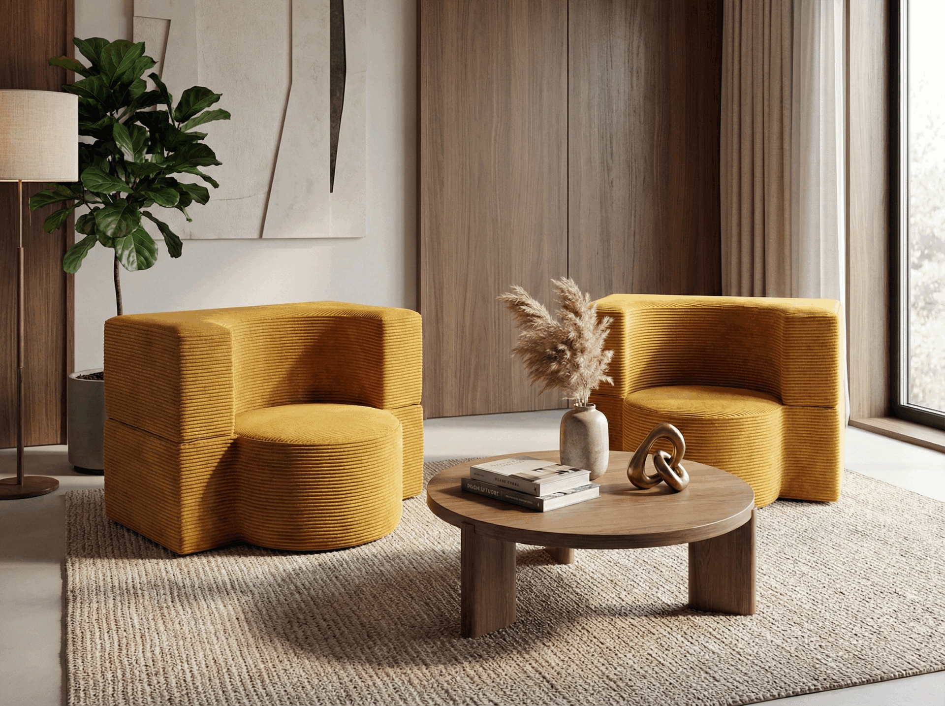 Zestaw foteli Arc to innowacyjne rozwiązanie, które łączy rzeźbiarski design z nieoczekiwaną funkcjonalnością. Dwa niezależne moduły o obłych kształtach tworzą stylową i niezwykle wygodną strefę wypoczynkową, idealną do salonu czy pokoju gościnnego. Całość została wykończona wysokiej jakości tkaniną sztruksową, której wyrazista struktura dodaje wnętrzu przytulności oraz szlachetnego charakteru.