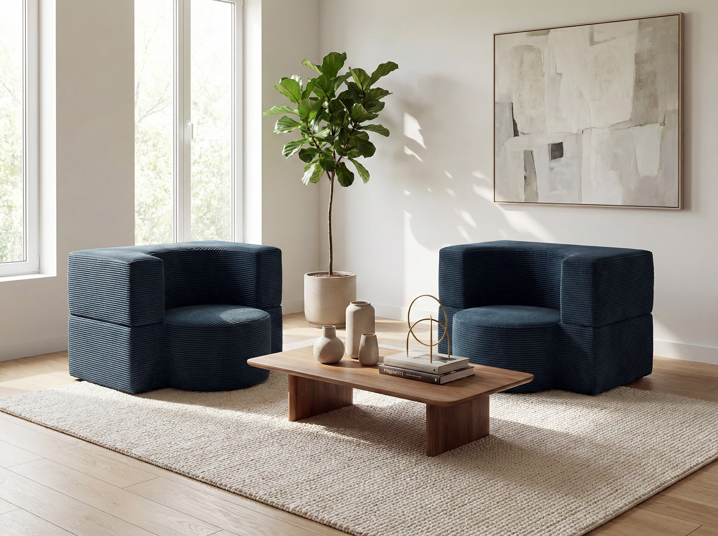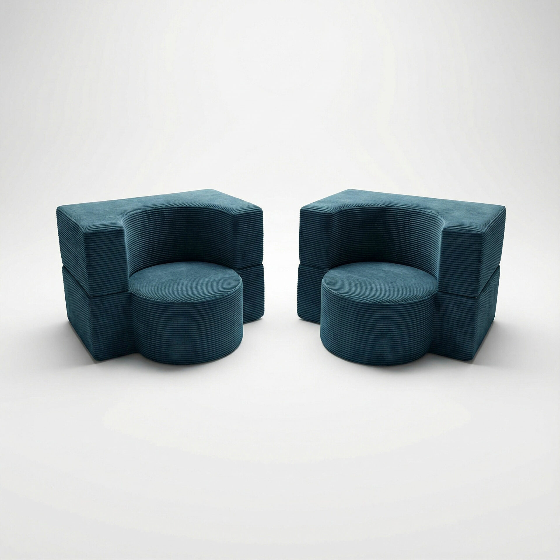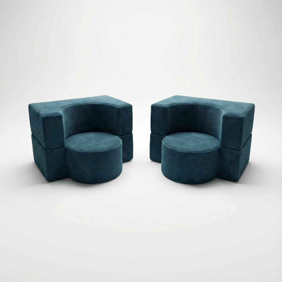 Zestaw foteli Arc to innowacyjne rozwiązanie, które łączy rzeźbiarski design z nieoczekiwaną funkcjonalnością. Dwa niezależne moduły o obłych kształtach tworzą stylową i niezwykle wygodną strefę wypoczynkową, idealną do salonu czy pokoju gościnnego. Całość została wykończona wysokiej jakości tkaniną sztruksową, której wyrazista struktura dodaje wnętrzu przytulności oraz szlachetnego charakteru.