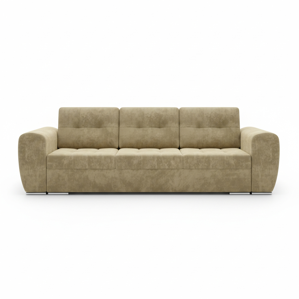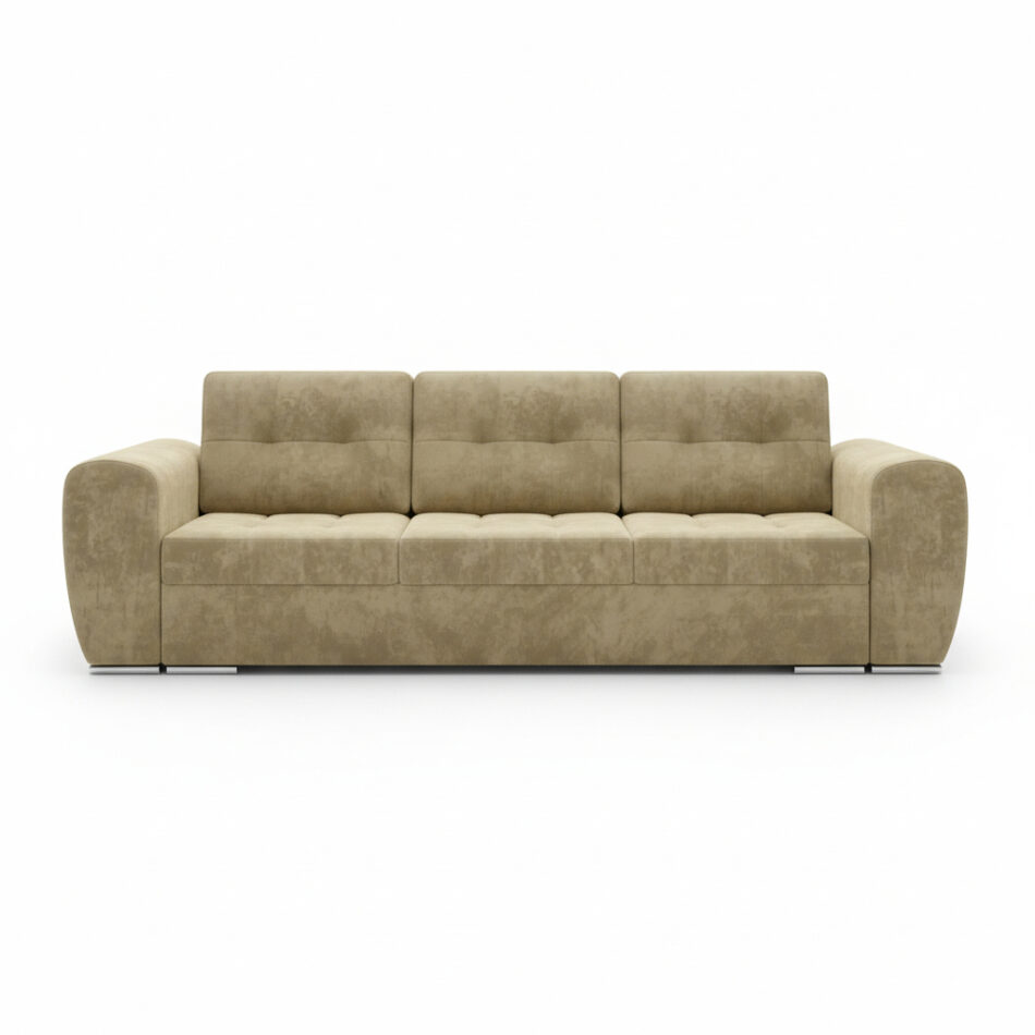 Jej ponadczasowy design zyskuje lekkość dzięki niskim, chromowanym nóżkom. Stanowi doskonałą bazę do aranżacji w stylu nowoczesnym oraz klasycznym. Ciepły, piaskowy odcień beżu wprowadza do salonu atmosferę spokoju i bezpieczeństwa. Dzięki temu wnętrze staje się przytulne i gotowe na przyjęcie domowników po długim dniu. Co ważne, tapicerowany tył mebla pozwala na ustawienie go w dowolnym miejscu. Kanapa będzie się pięknie prezentować nawet na środku pokoju.