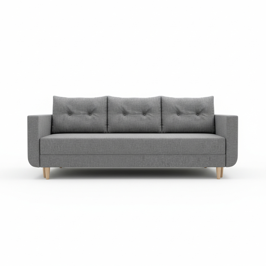 Jej prosta, a zarazem ponadczasowa bryła doskonale wpisuje się zarówno w nowoczesne, jak i klasyczne aranżacje. Wysokie nóżki z litego drewna w kolorze buku dodają jej wizualnej lekkości. Dzięki nim utrzymanie porządku pod meblem staje się wyjątkowo proste. Szara tapicerka jest synonimem elegancji i wszechstronności. Odcień ten tworzy spokojną i stonowaną bazę dla każdego wnętrza. Pięknie komponuje się z wyrazistymi kolorami oraz naturalnymi dodatkami.