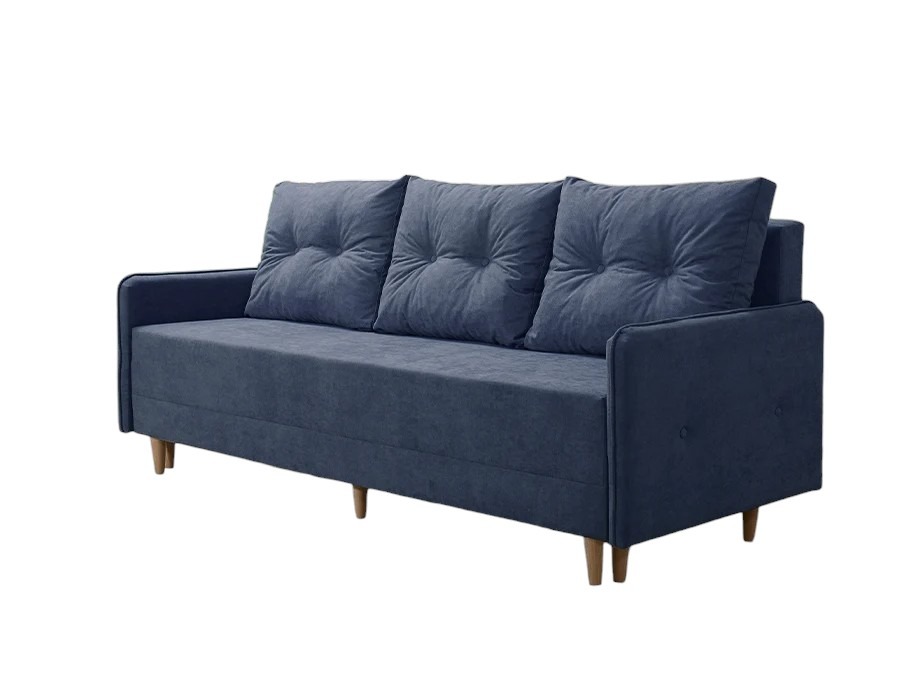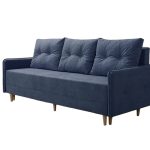 Jej prosty, klasyczny kształt opiera się na wysokich nogach z naturalnego drewna bukowego. Dzięki temu cała bryła zyskuje wizualną lekkość i nowoczesny charakter. Głęboki, granatowy kolor tapicerki wprowadza do wnętrza spokój i poczucie elegancji. Taka barwa doskonale komponuje się z jasnymi ścianami, drewnianymi dodatkami czy metalicznymi akcentami. Co ważne, tapicerowany tył pozwala ustawić kanapę w dowolnym miejscu salonu, nie tylko przy ścianie.