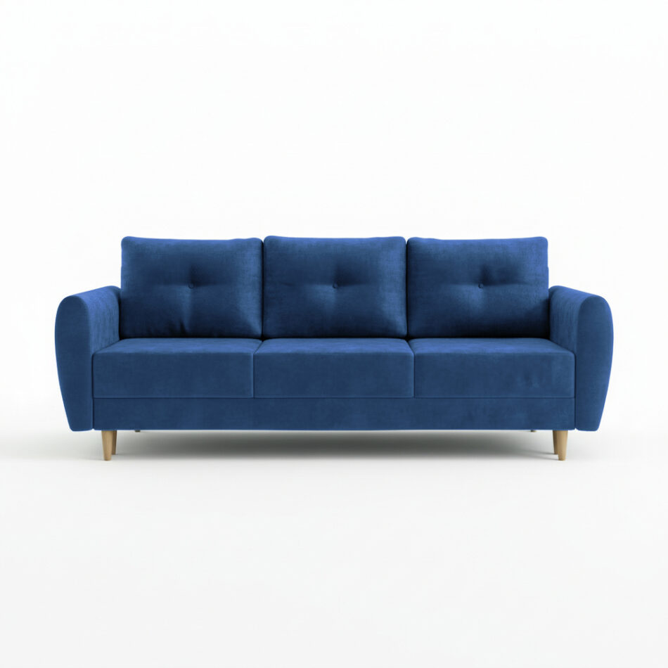 Głęboki, granatowy kolor tapicerki nadaje wnętrzu szlachetny i spokojny charakter. Taka barwa staje się wyrazistym akcentem lub stonowaną bazą dla przytulnego salonu. Dzięki temu kanapa świetnie komponuje się z naturalnym drewnem, metalicznymi dodatkami oraz jasnymi ścianami. Co ważne, tapicerowany tył mebla pozwala na dowolne ustawienie go w pomieszczeniu. Można go umieścić nawet na środku salonu, tworząc funkcjonalne strefy wypoczynku.