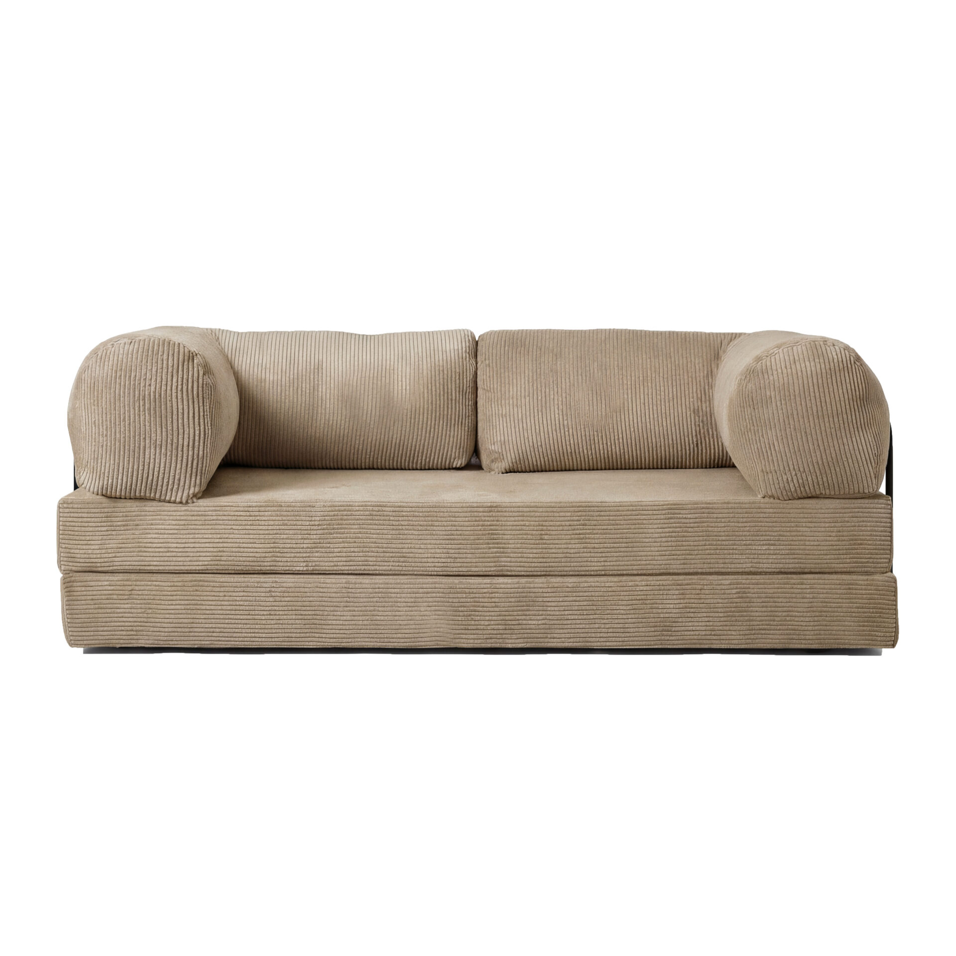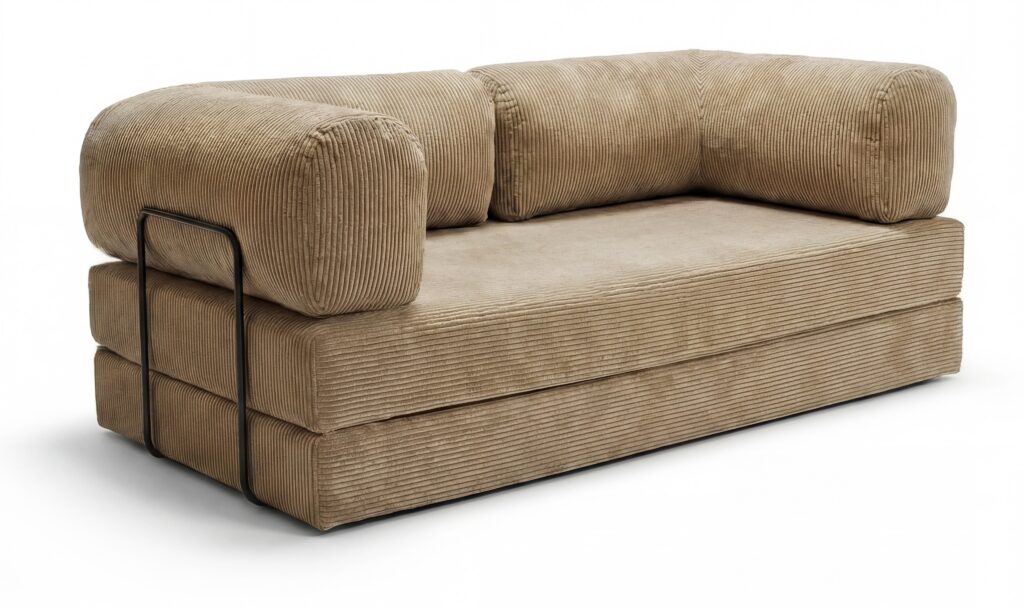 Rozkładana sofa podłogowa/futon łączy wygodę i oszczędność miejsca. Tapicerka sztruksowa jest miękka w dotyku, a jednocześnie odporna na codzienne użytkowanie. Dwie duże poduchy tworzą narożne oparcie, które sprawdza się zarówno do czytania, jak i oglądania filmów. Po rozłożeniu otrzymujesz płaską, równą powierzchnię spania – świetną dla gości lub popołudniowej drzemki. Boczne stalowe uchwyty stabilizują konstrukcję, a prosta budowa umożliwia szybkie składanie i przechowywanie. To idealny wybór do małych mieszkań, kawalerek i nowoczesnych aranżacji typu „compact living”.