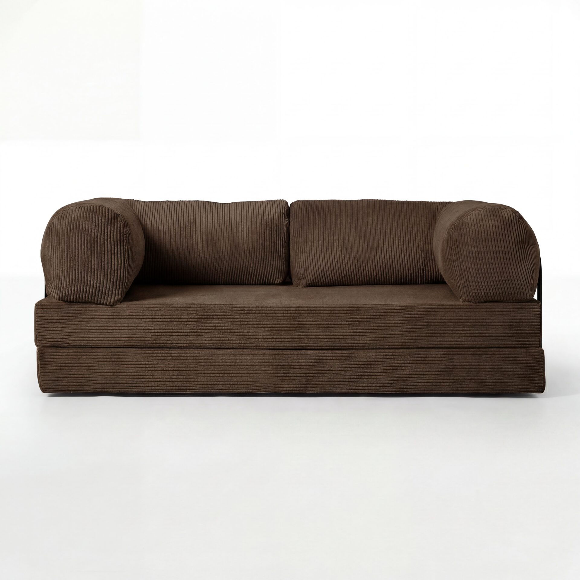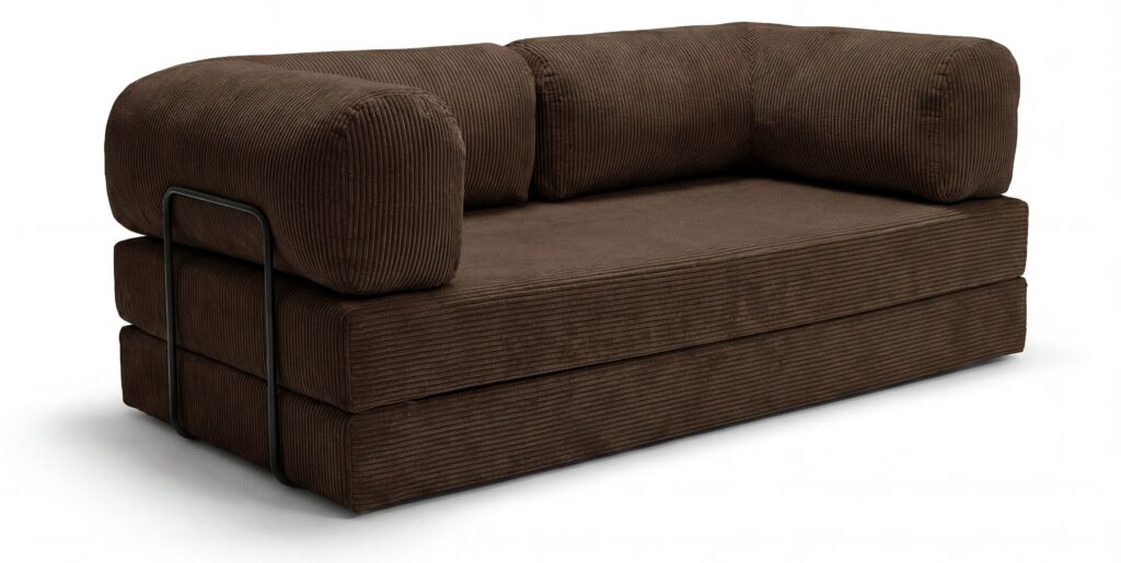 Rozkładana sofa podłogowa/futon łączy wygodę i oszczędność miejsca. Tapicerka sztruksowa jest miękka w dotyku, a jednocześnie odporna na codzienne użytkowanie. Dwie duże poduchy tworzą narożne oparcie, które sprawdza się zarówno do czytania, jak i oglądania filmów. Po rozłożeniu otrzymujesz płaską, równą powierzchnię spania – świetną dla gości lub popołudniowej drzemki. Boczne stalowe uchwyty stabilizują konstrukcję, a prosta budowa umożliwia szybkie składanie i przechowywanie. To idealny wybór do małych mieszkań, kawalerek i nowoczesnych aranżacji typu „compact living”.