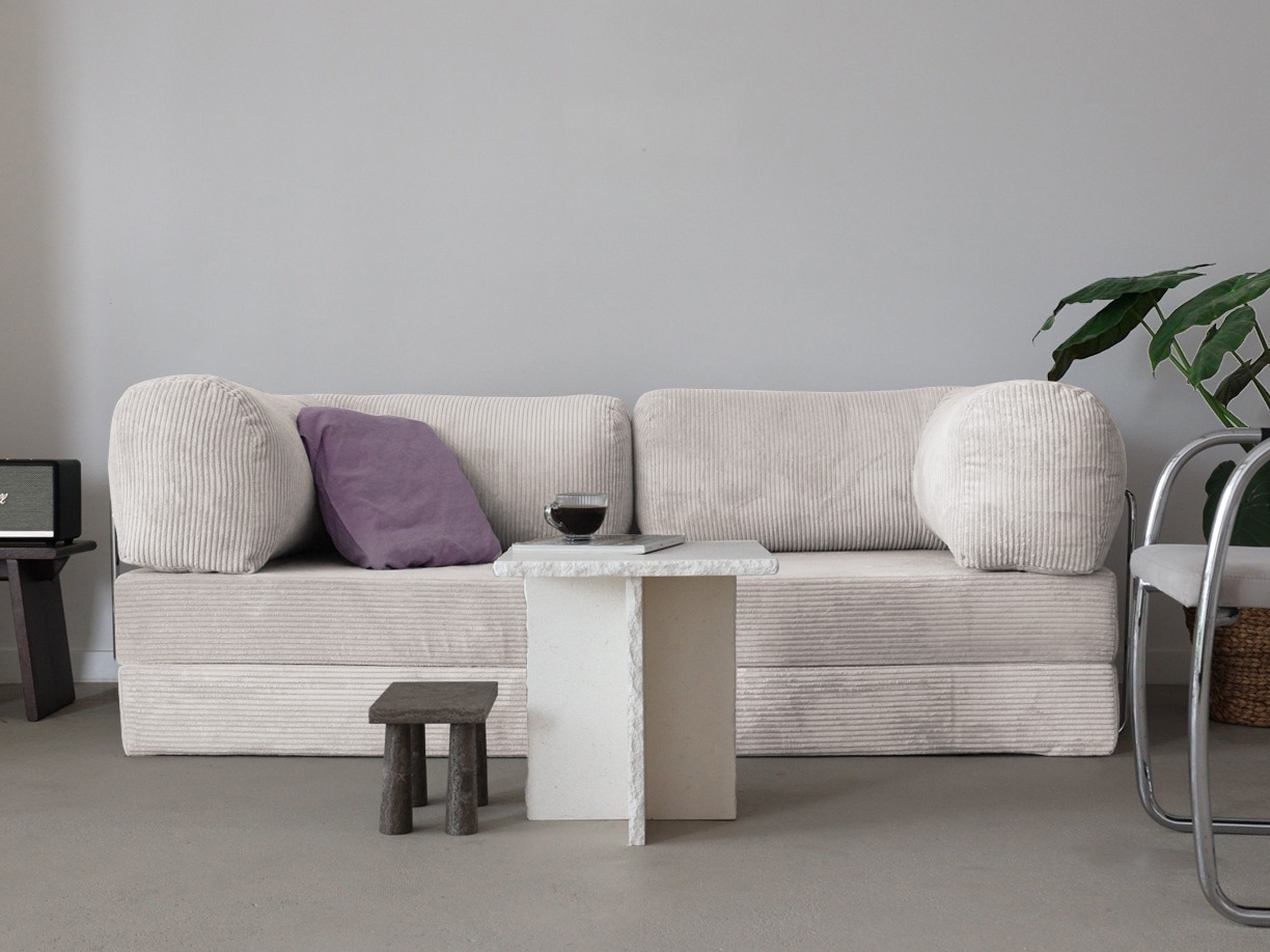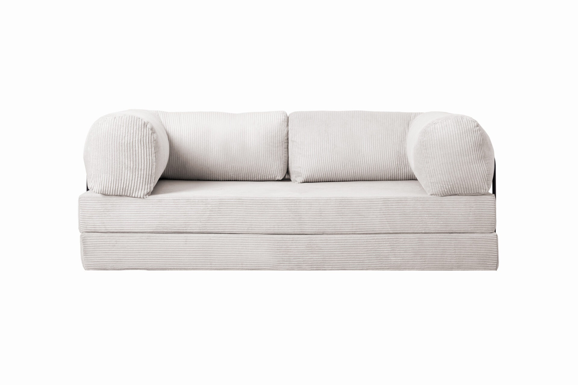 Rozkładana sofa podłogowa/futon łączy wygodę i oszczędność miejsca. Tapicerka sztruksowa jest miękka w dotyku, a jednocześnie odporna na codzienne użytkowanie. Dwie duże poduchy tworzą narożne oparcie, które sprawdza się zarówno do czytania, jak i oglądania filmów. Po rozłożeniu otrzymujesz płaską, równą powierzchnię spania – świetną dla gości lub popołudniowej drzemki. Boczne stalowe uchwyty stabilizują konstrukcję, a prosta budowa umożliwia szybkie składanie i przechowywanie. To idealny wybór do małych mieszkań, kawalerek i nowoczesnych aranżacji typu „compact living”.