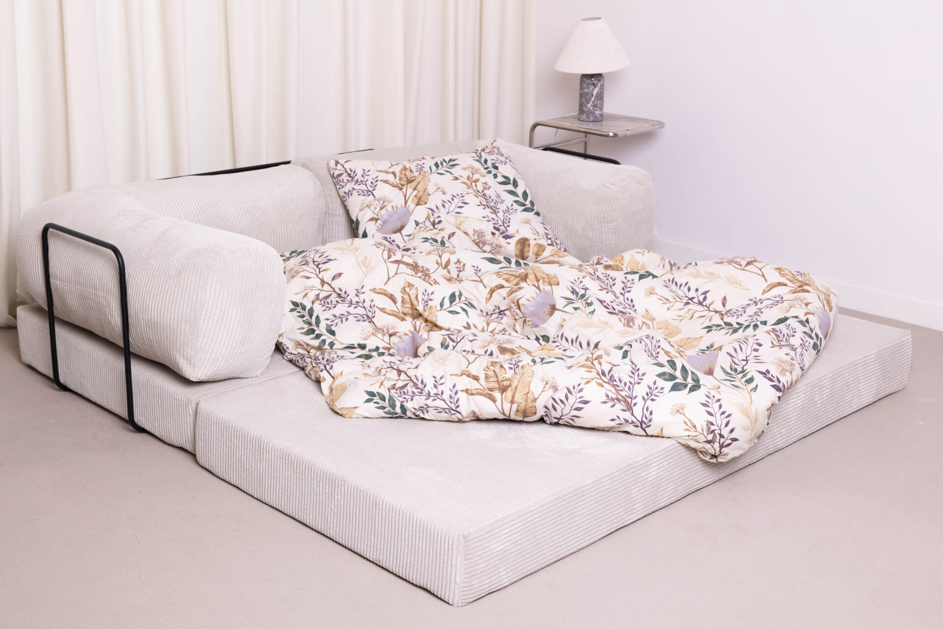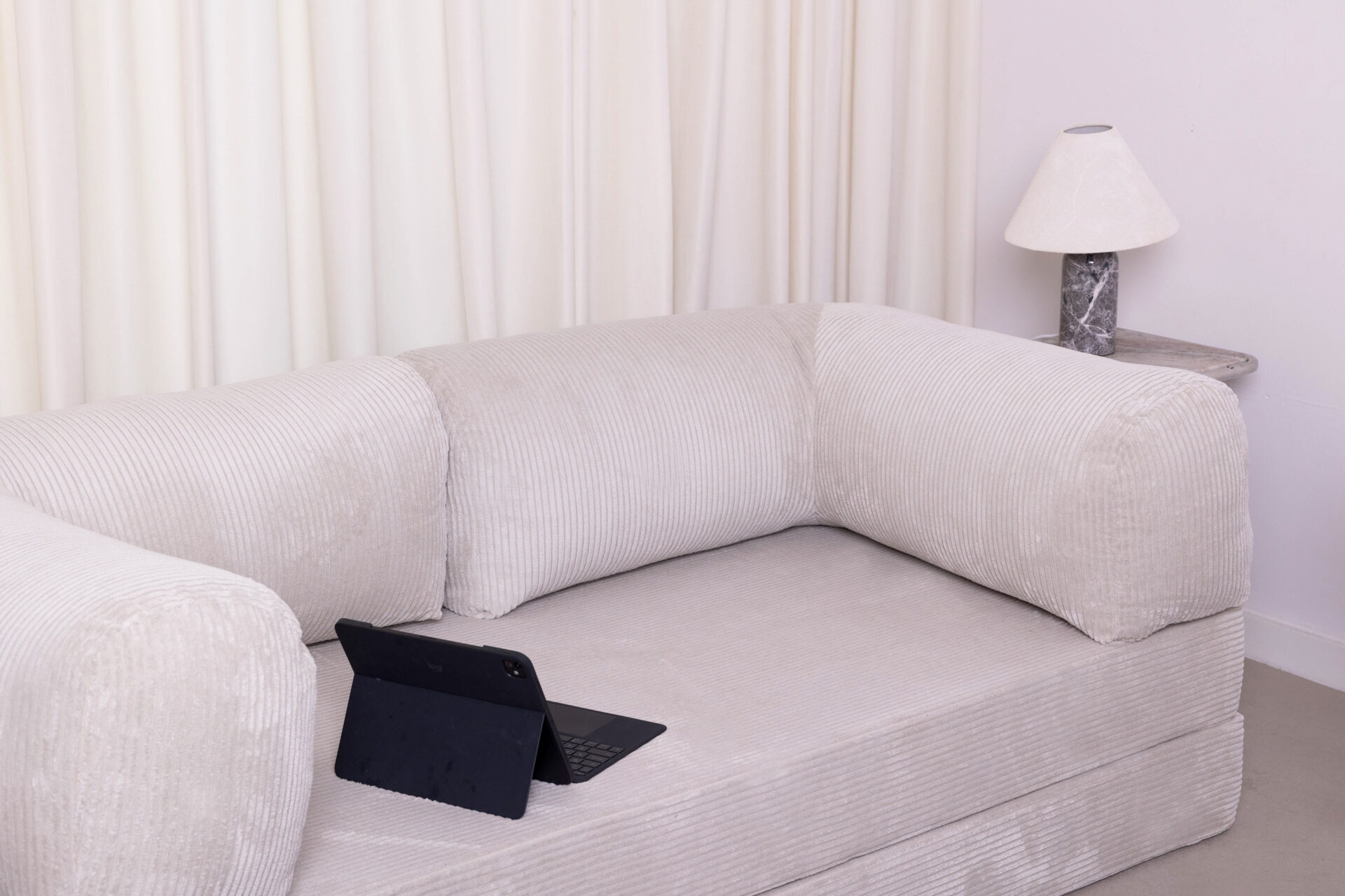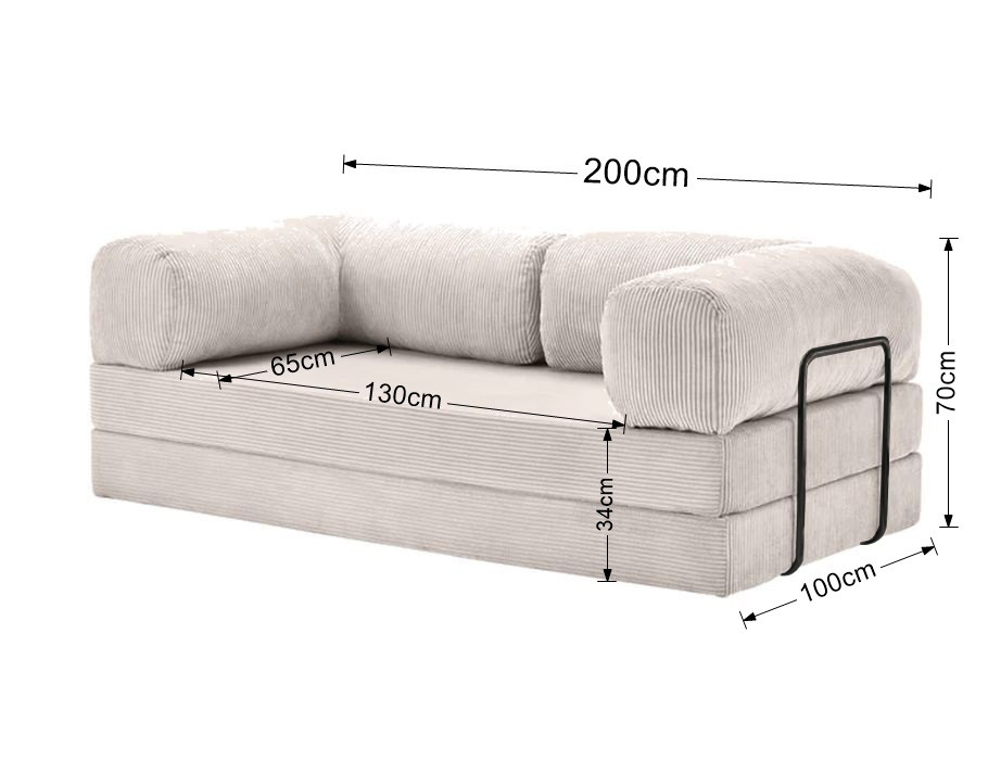 Rozkładana sofa podłogowa/futon łączy wygodę i oszczędność miejsca. Tapicerka sztruksowa jest miękka w dotyku, a jednocześnie odporna na codzienne użytkowanie. Dwie duże poduchy tworzą narożne oparcie, które sprawdza się zarówno do czytania, jak i oglądania filmów. Po rozłożeniu otrzymujesz płaską, równą powierzchnię spania – świetną dla gości lub popołudniowej drzemki. Boczne stalowe uchwyty stabilizują konstrukcję, a prosta budowa umożliwia szybkie składanie i przechowywanie. To idealny wybór do małych mieszkań, kawalerek i nowoczesnych aranżacji typu „compact living”.