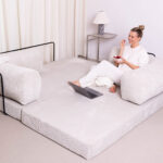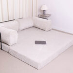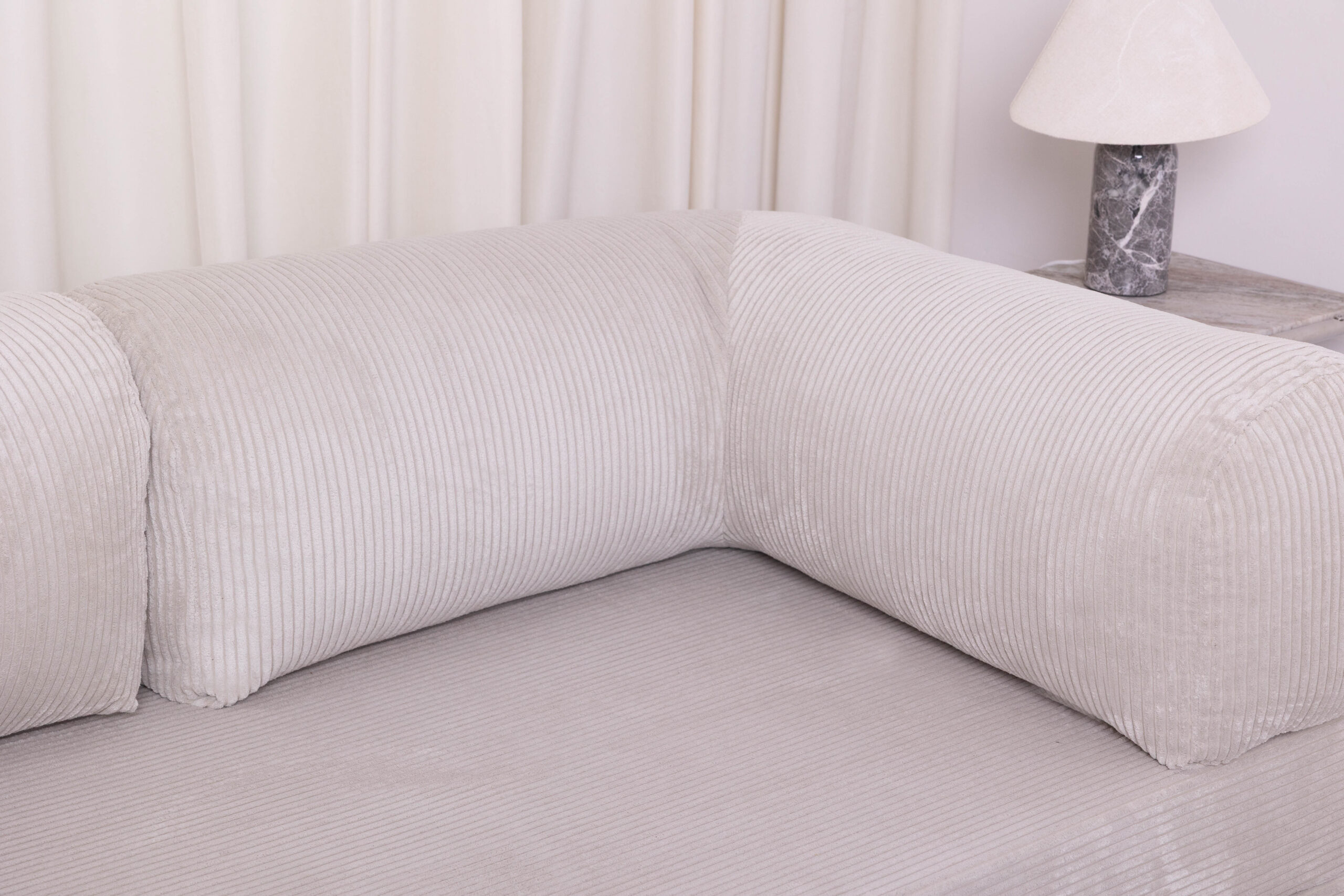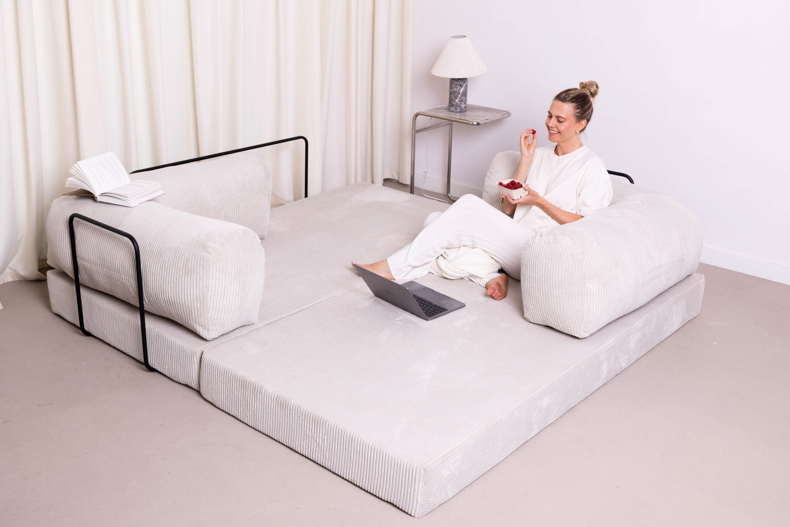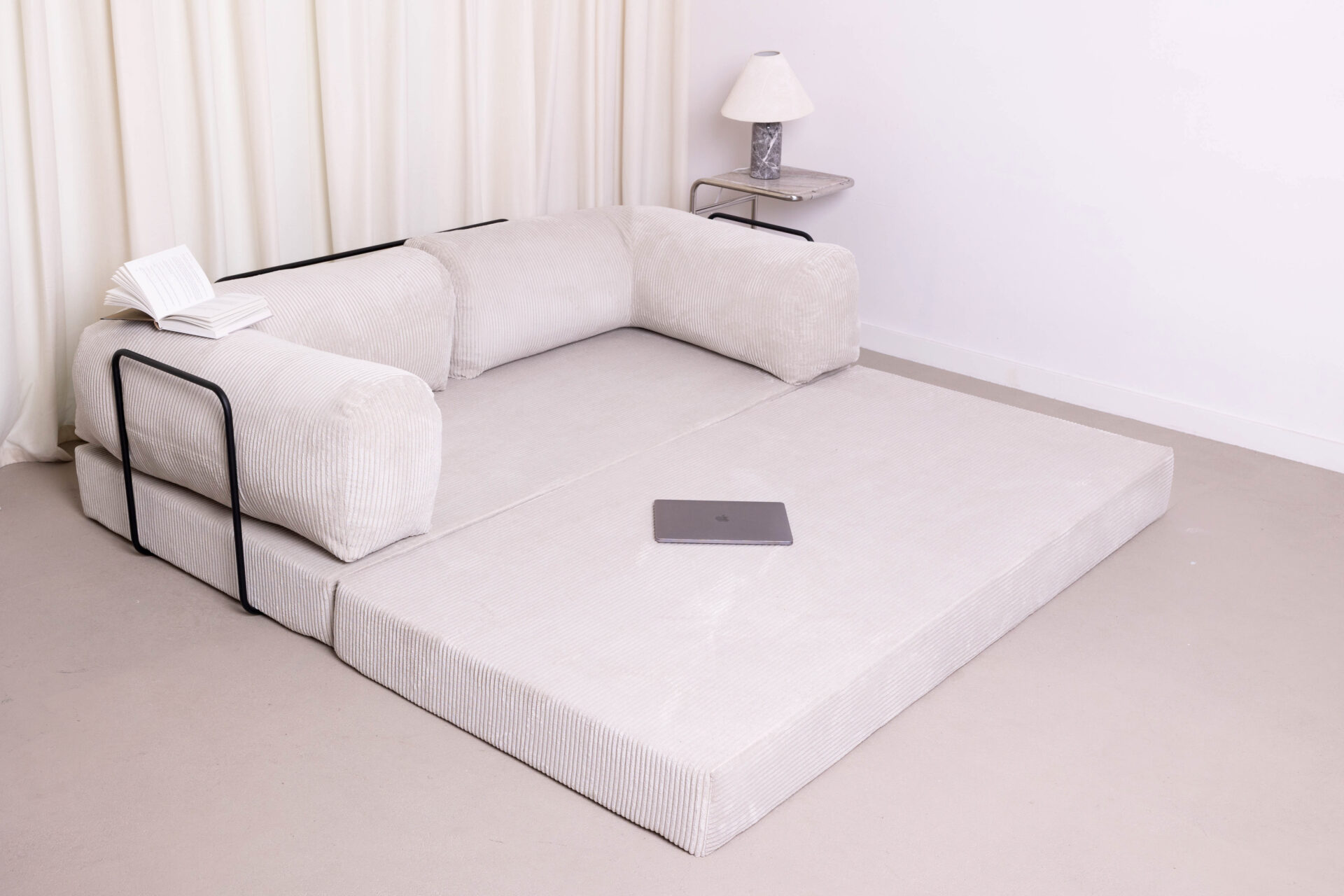 Rozkładana sofa podłogowa/futon łączy wygodę i oszczędność miejsca. Tapicerka sztruksowa jest miękka w dotyku, a jednocześnie odporna na codzienne użytkowanie. Dwie duże poduchy tworzą narożne oparcie, które sprawdza się zarówno do czytania, jak i oglądania filmów. Po rozłożeniu otrzymujesz płaską, równą powierzchnię spania – świetną dla gości lub popołudniowej drzemki. Boczne stalowe uchwyty stabilizują konstrukcję, a prosta budowa umożliwia szybkie składanie i przechowywanie. To idealny wybór do małych mieszkań, kawalerek i nowoczesnych aranżacji typu „compact living”.