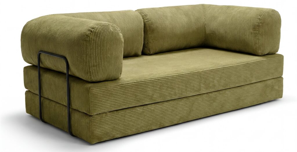 Rozkładana sofa podłogowa/futon łączy wygodę i oszczędność miejsca. Tapicerka sztruksowa jest miękka w dotyku, a jednocześnie odporna na codzienne użytkowanie. Dwie duże poduchy tworzą narożne oparcie, które sprawdza się zarówno do czytania, jak i oglądania filmów. Po rozłożeniu otrzymujesz płaską, równą powierzchnię spania – świetną dla gości lub popołudniowej drzemki. Boczne stalowe uchwyty stabilizują konstrukcję, a prosta budowa umożliwia szybkie składanie i przechowywanie. To idealny wybór do małych mieszkań, kawalerek i nowoczesnych aranżacji typu „compact living”.