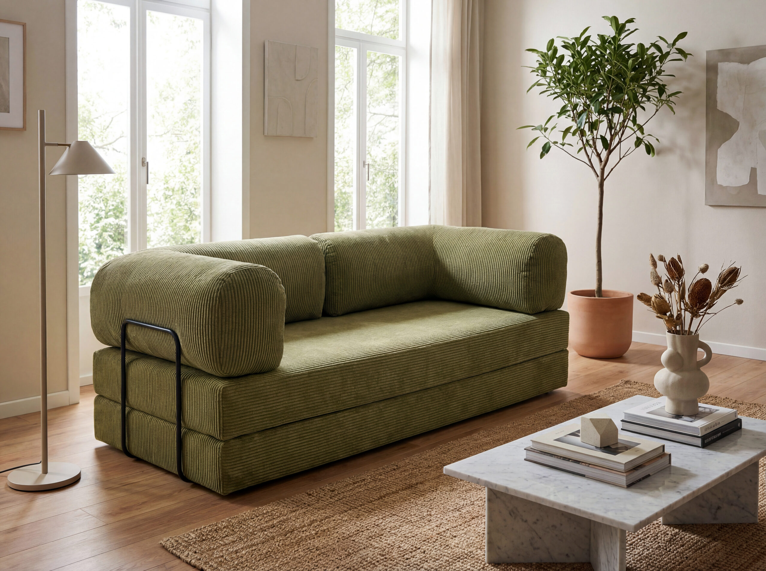 Rozkładana sofa podłogowa/futon łączy wygodę i oszczędność miejsca. Tapicerka sztruksowa jest miękka w dotyku, a jednocześnie odporna na codzienne użytkowanie. Dwie duże poduchy tworzą narożne oparcie, które sprawdza się zarówno do czytania, jak i oglądania filmów. Po rozłożeniu otrzymujesz płaską, równą powierzchnię spania – świetną dla gości lub popołudniowej drzemki. Boczne stalowe uchwyty stabilizują konstrukcję, a prosta budowa umożliwia szybkie składanie i przechowywanie. To idealny wybór do małych mieszkań, kawalerek i nowoczesnych aranżacji typu „compact living”.