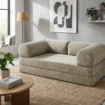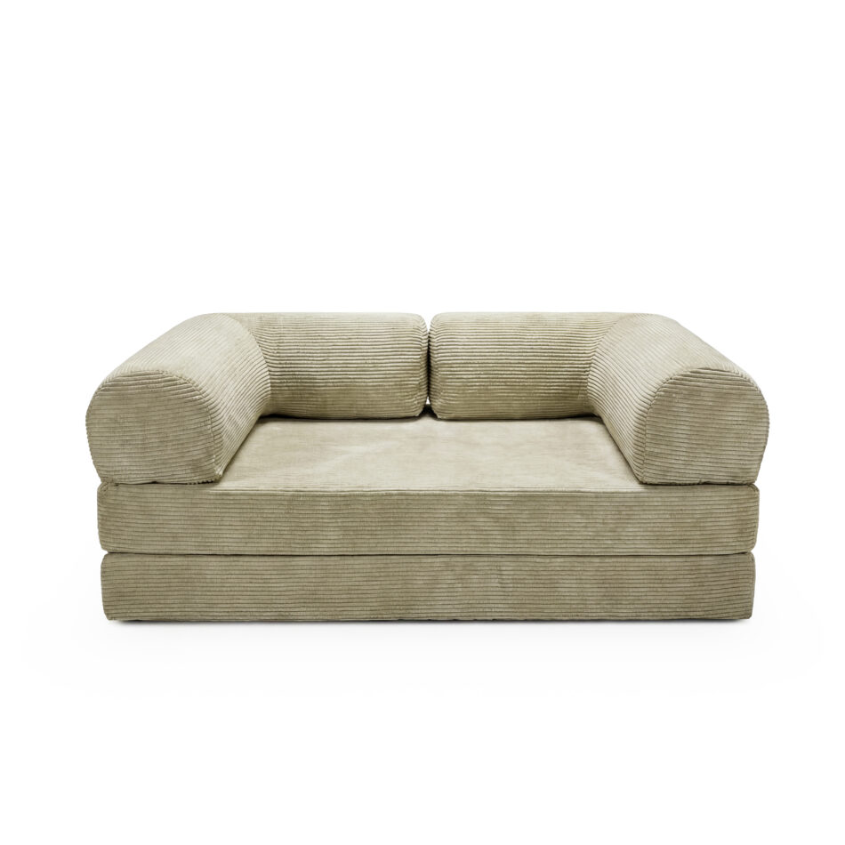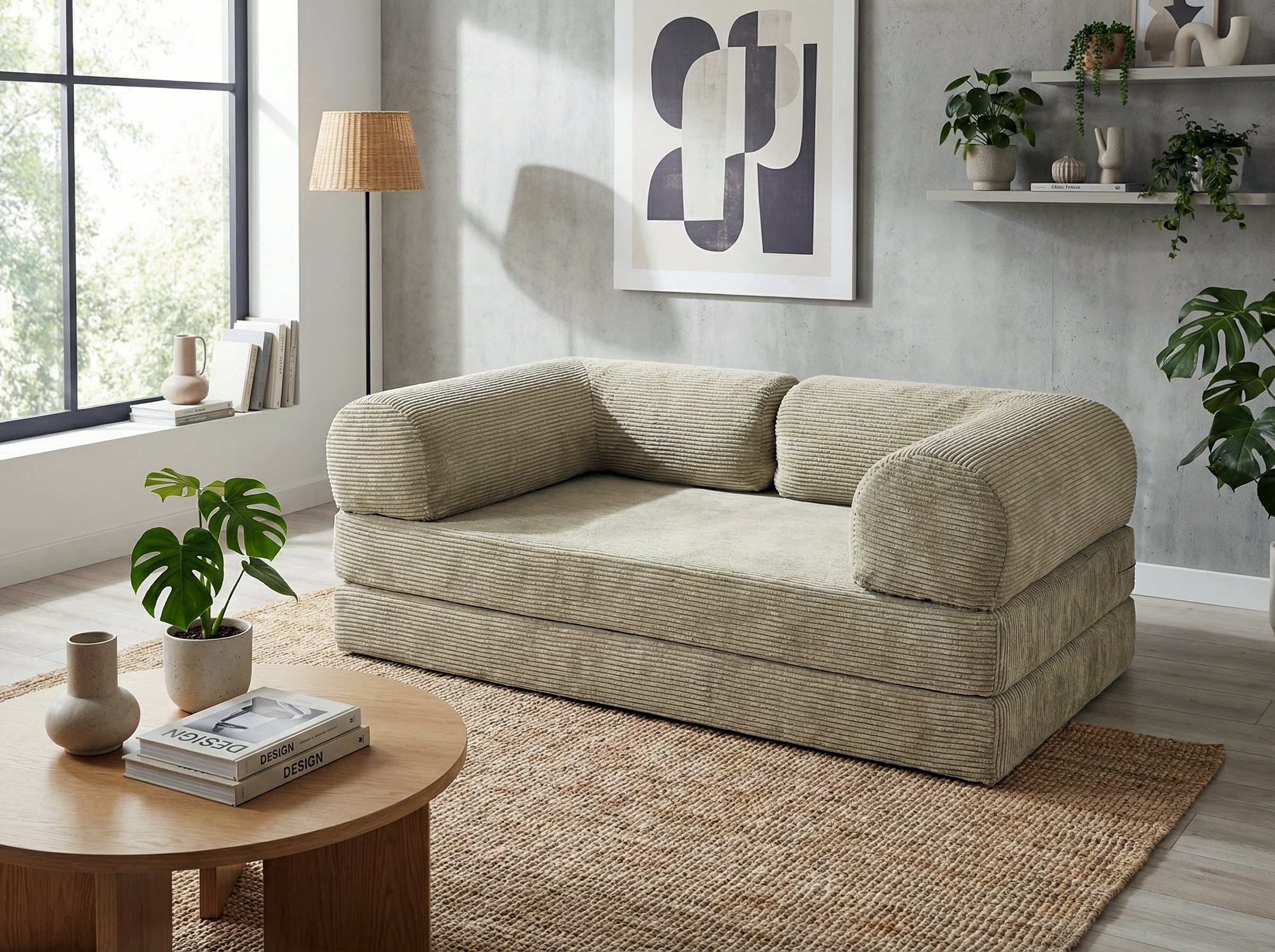 Dwie duże poduchy tworzą komfortowe, narożne oparcie – idealne do czytania, oglądania filmów czy relaksu z laptopem. Po rozłożeniu sofa zamienia się w płaską, równą powierzchnię spania – świetną dla gości lub na popołudniową drzemkę.