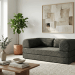 Dwie duże poduchy tworzą komfortowe, narożne oparcie – idealne do czytania, oglądania filmów czy relaksu z laptopem. Po rozłożeniu sofa zamienia się w płaską, równą powierzchnię spania – świetną dla gości lub na popołudniową drzemkę.