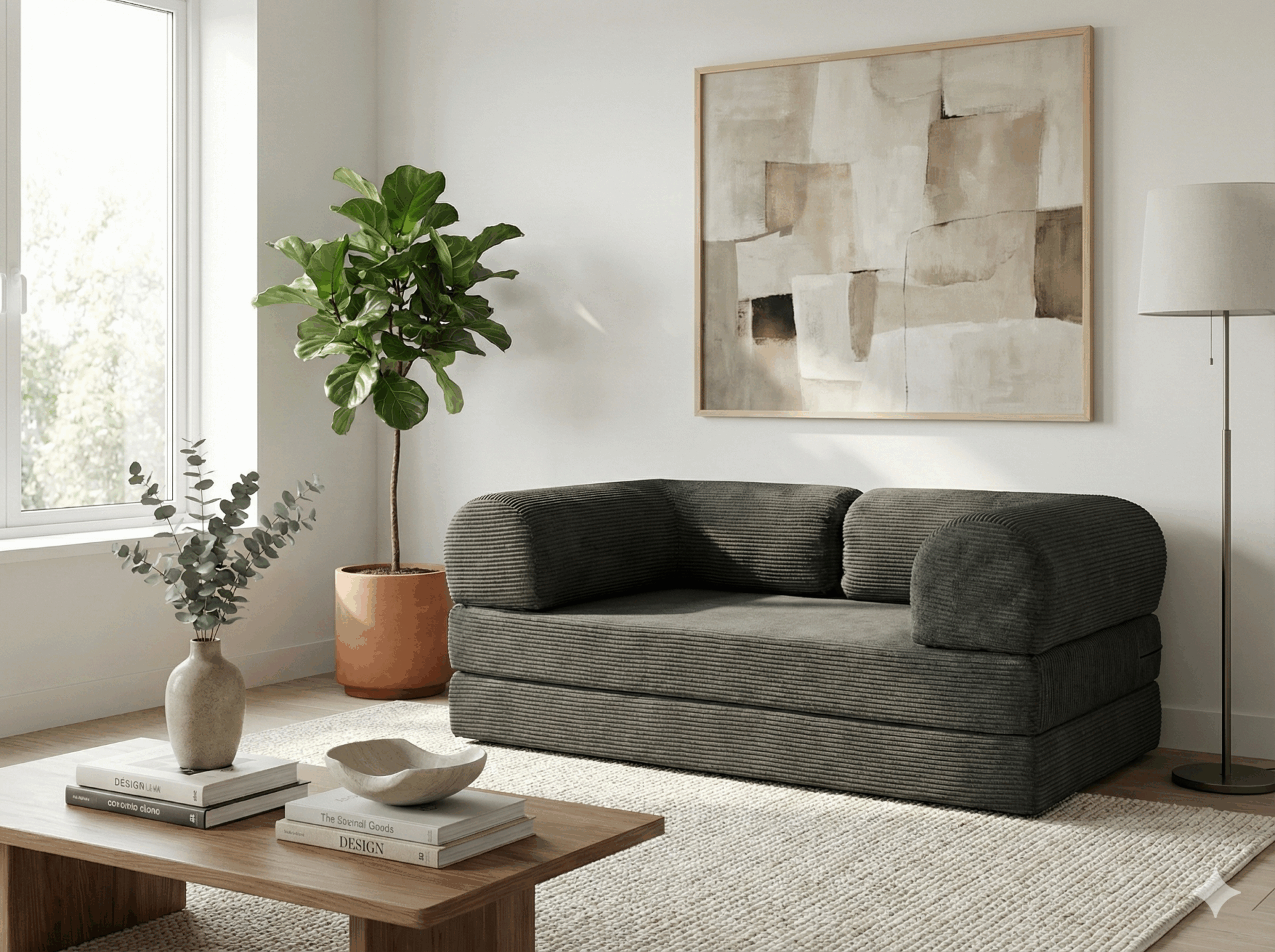 Rozkładana sofa podłogowa Halo łączy wygodę z maksymalną oszczędnością miejsca. To lekka, modułowa forma wypoczynku, która doskonale sprawdzi się w nowoczesnych wnętrzach typu „compact living”. Miękka tapicerka sztruksowa jest przyjemna w dotyku, a jednocześnie odporna na codzienne użytkowanie.