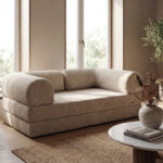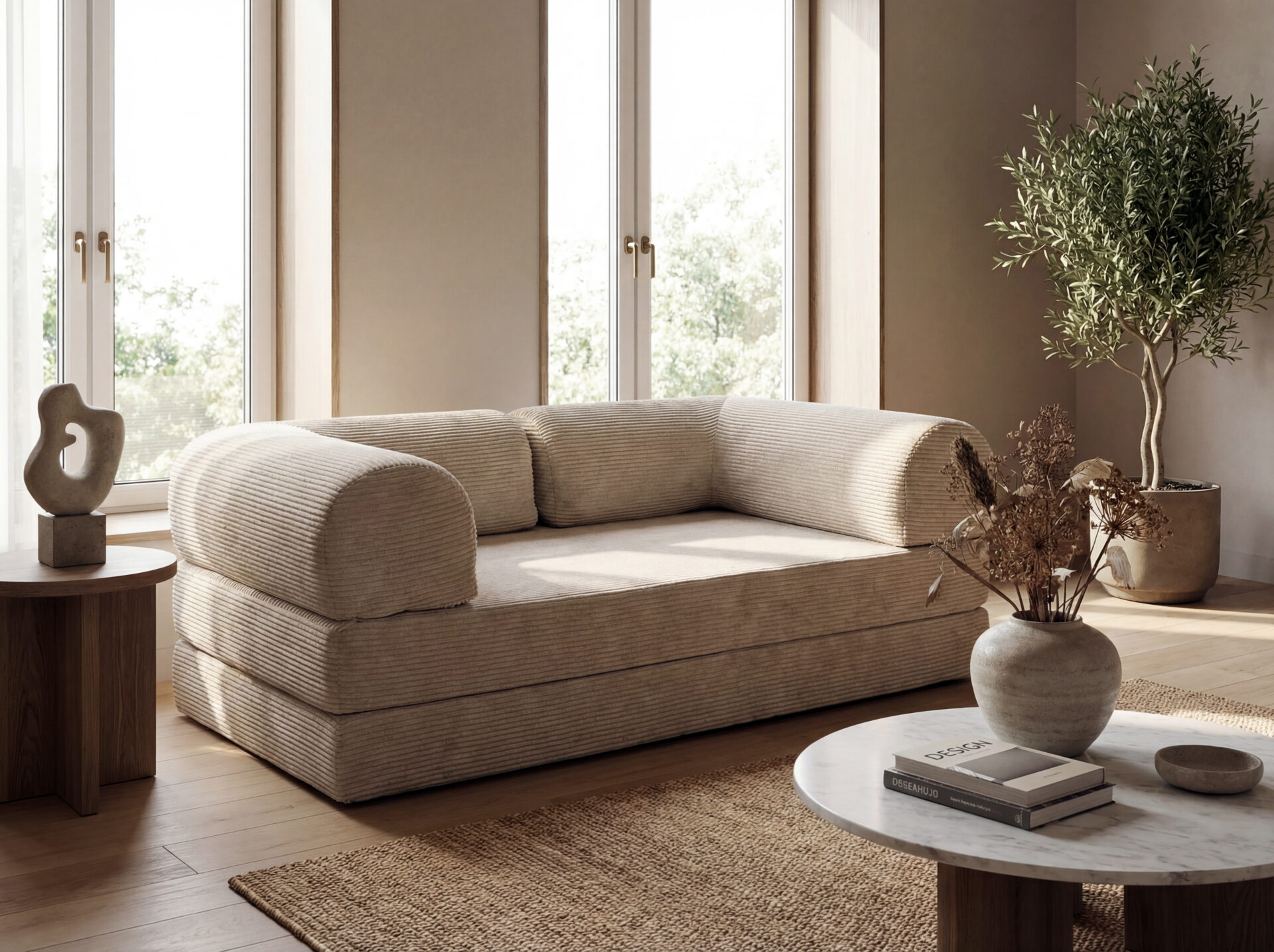 Rozkładana sofa podłogowa Halo łączy wygodę z maksymalną oszczędnością miejsca. To lekka, modułowa forma wypoczynku, która doskonale sprawdzi się w nowoczesnych wnętrzach typu „compact living”. Miękka tapicerka sztruksowa jest przyjemna w dotyku, a jednocześnie odporna na codzienne użytkowanie.