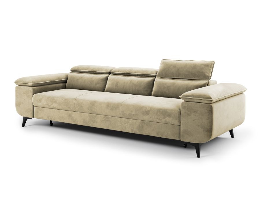 Jej uniwersalny design harmonijnie łączy klasyczne proporcje z nowoczesnymi akcentami. Smukłe, czarne metalowe nóżki w kształcie gwiazdy nadają meblowi lekkości i designerskiego charakteru. Ciepły, beżowy kolor wprowadza do wnętrza spokój i przytulność, stanowiąc doskonałą bazę dla różnych aranżacji. Tył mebla również został obity tkaniną, dzięki czemu kanapę można ustawić w dowolnym miejscu salonu.