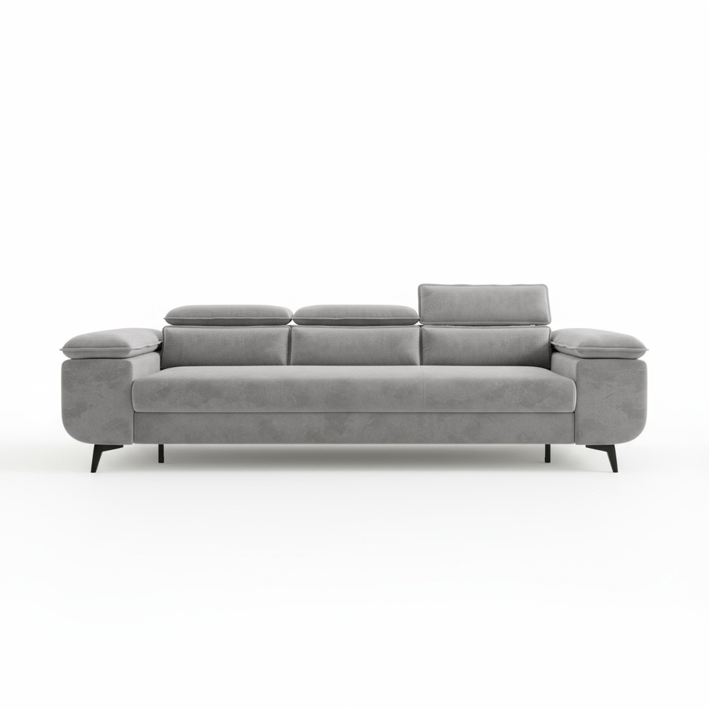 Jej uniwersalny design harmonijnie łączy klasyczne proporcje z nowoczesnymi akcentami. Smukłe, czarne metalowe nóżki w kształcie gwiazdy nadają meblowi lekkości i designerskiego charakteru. Delikatny, jasnoszary kolor wprowadza do wnętrza spokój i subtelną elegancję, stanowiąc doskonałe tło zarówno dla stonowanych, jak i wyrazistych dodatków. Tył mebla również został obity tkaniną, dzięki czemu kanapę można ustawić w dowolnym miejscu salonu.