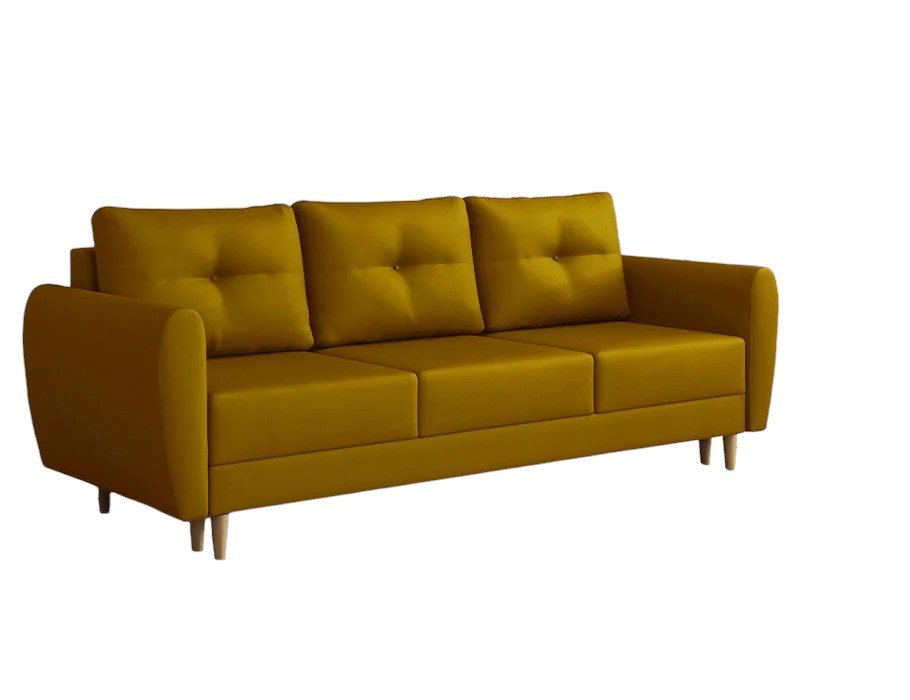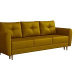 Jej prostą bryłę osadzono na wysokich, drewnianych nóżkach w naturalnym kolorze. Nadają one całej konstrukcji wizualnej lekkości i subtelnej elegancji. Intensywny, musztardowy kolor tapicerki fantastycznie ożywia aranżację. Wprowadza do salonu dawkę słonecznej energii i przyjaznego ciepła. Dlatego ten odcień doskonale pasuje zarówno do wnętrz klasycznych, jak i nowoczesnych. Co ważne, tył mebla również pokryto tkaniną. Pozwala to na ustawienie kanapy w dowolnym miejscu, nawet na środku pokoju.