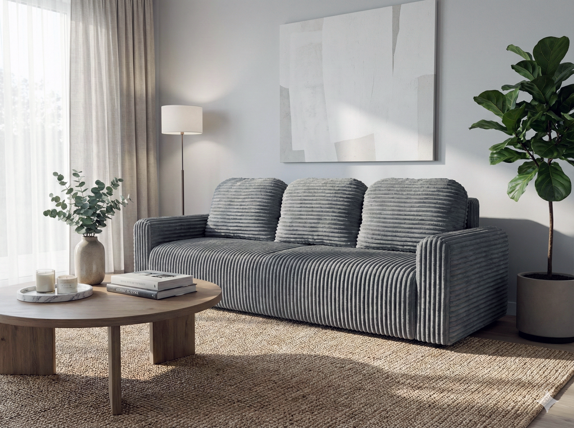 To, co wyróżnia model Nesso, to tapicerka wykonana z miękkiej tkaniny o wyraźnej, sztruksowej strukturze. Nadaje ona meblowi unikalnego charakteru, sprawiając, że salon staje się bardziej przytulny. Dzięki tapicerowanemu tyłowi kanapa jest meblem wolnostojącym – możesz ją z powodzeniem ustawić nie tylko pod ścianą, ale również w centralnym punkcie pomieszczenia.