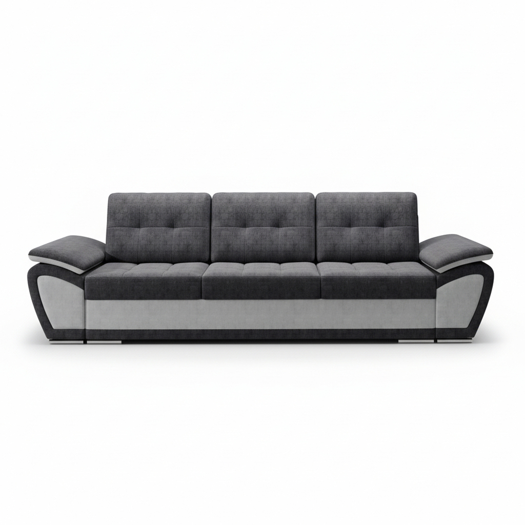 Jej uniwersalny design czerpie z nowoczesnej klasyki. Dlatego doskonale odnajduje się w wielu aranżacjach. Głębokie odcienie czerni i szarości nadają pomieszczeniu wyrafinowanego charakteru. Subtelne, chromowane nóżki dodają jej wizualnej lekkości. Co ważne, tapicerowany tył pozwala na ustawienie kanapy w dowolnym miejscu salonu. Może stać się centralnym punktem otwartej przestrzeni.