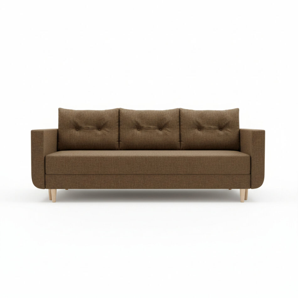 Jej uniwersalny design opiera się na prostych liniach i eleganckim wykończeniu. Dzięki temu z łatwością dopasuje się do wnętrz nowoczesnych oraz klasycznych. Wysokie nóżki z drewna bukowego dodają bryle wizualnej lekkości. Głęboki, brązowy odcień wprowadza do pomieszczenia poczucie bezpieczeństwa i spokoju. W ten sposób salon staje się idealnym miejscem do wyciszenia po długim dniu. Co ważne, tapicerowany tył pozwala ustawić kanapę w dowolnym miejscu, nawet na środku pokoju.