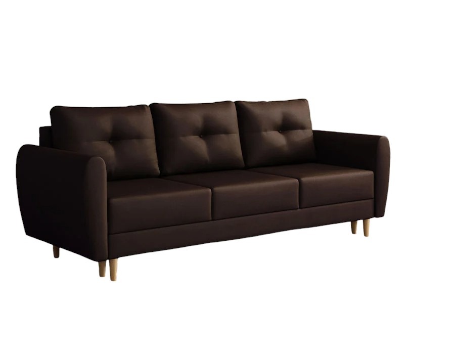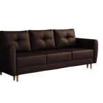 Jej prosta bryła opiera się na wysokich, drewnianych nóżkach w kolorze naturalnego buku. W ten sposób zyskuje wizualną lekkość. Ciepły, głęboki brąz tapicerki tworzy we wnętrzu przytulną atmosferę. Dlatego salon staje się idealnym miejscem do odpoczynku po długim dniu. Kanapa świetnie komponuje się z naturalnymi materiałami oraz stonowaną paletą barw. Co ważne, tapicerowany tył pozwala na ustawienie mebla w dowolnym miejscu, nawet na środku pokoju.