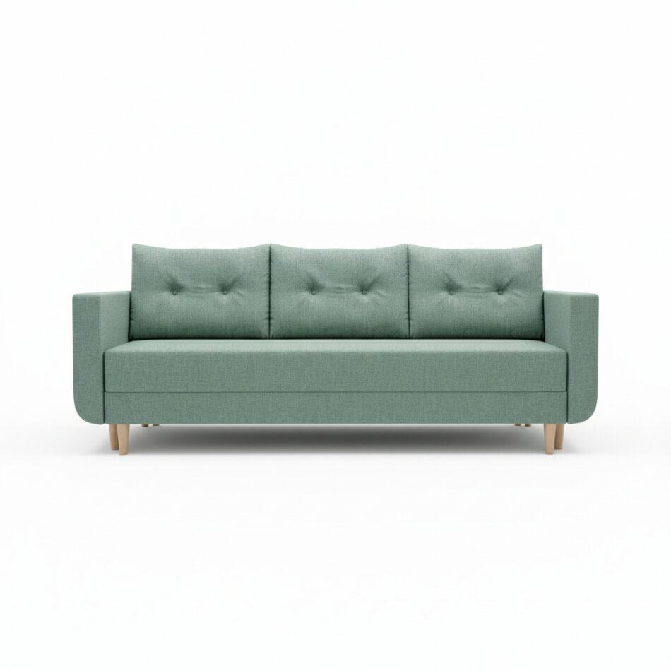 Siedzisko wypełnione sprężynami bonellowymi oraz pianką zapewnia stabilne i komfortowe podparcie. Idealnie sprawdza się podczas wieczornego relaksu z książką. Trzy duże poduszki oparciowe pozwalają wygodnie się oprzeć. Kanapa posiada także praktyczną funkcję spania. Jej proste rozkładanie pozwala szybko przygotować miejsce noclegowe dla gości. Dodatkowy pojemnik dyskretnie mieści pościel lub koce, pomagając w zachowaniu porządku.