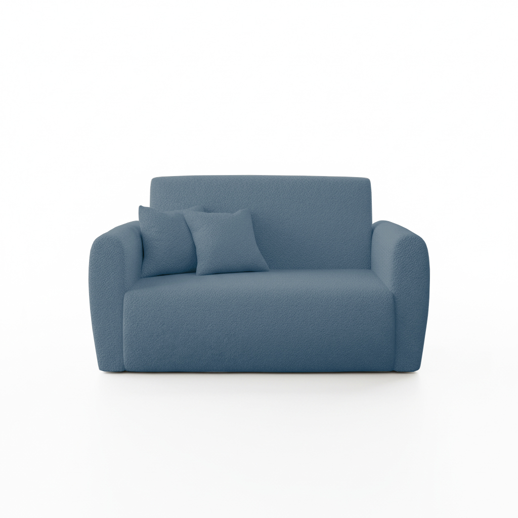 Jej kompaktowy kształt idealnie pasuje do pokoju młodzieżowego lub niewielkiego salonu. Charakterystyczna pętelkowa struktura materiału nadaje meblowi przytulny i ciekawy wygląd. Niebieski odcień tapicerki wprowadza do aranżacji spokój i poczucie swobody. Dzięki temu wnętrze staje się miejscem relaksu i wyciszenia po długim dniu. Co ważne, tapicerowany tył pozwala ustawić amerykankę w dowolnym miejscu, nawet na środku pokoju.
