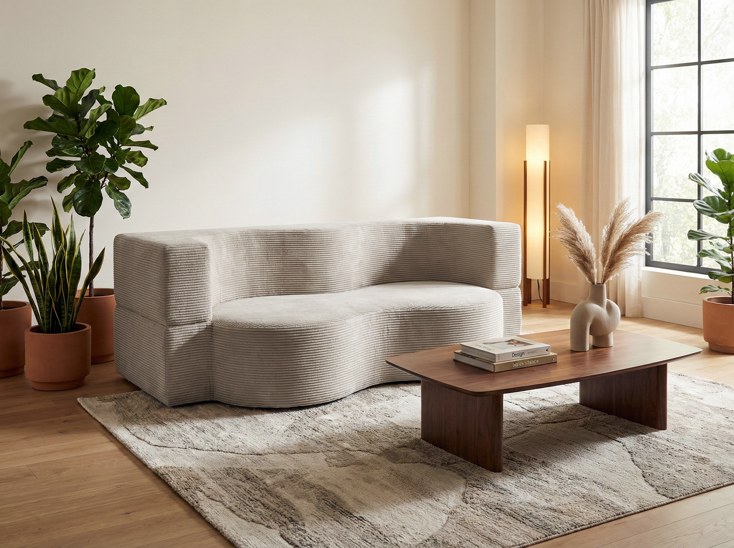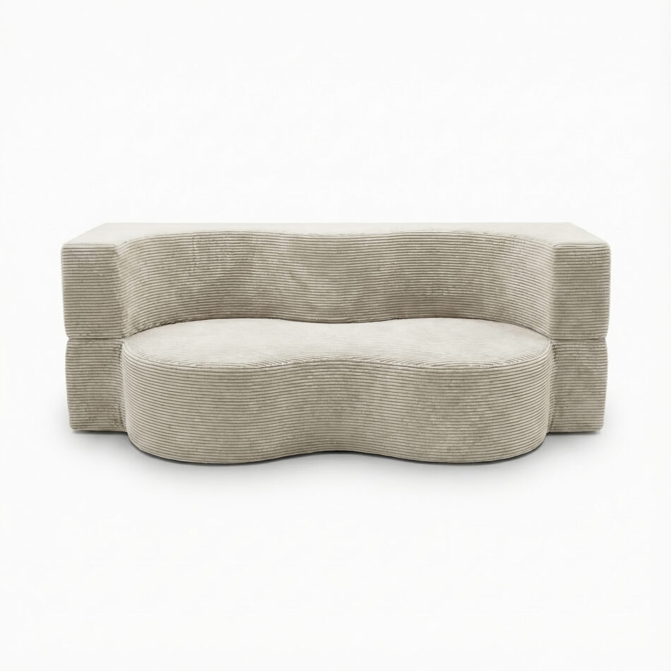 Sofa Arc została obita miękką, przyjemną w dotyku tkaniną sztruksową, której wyraźna struktura podkreśla jej nowoczesny charakter i nadaje całości ciepła. To materiał doskonale sprawdzający się w codziennym użytkowaniu, łatwy do dopasowania do różnych stylów wnętrz.