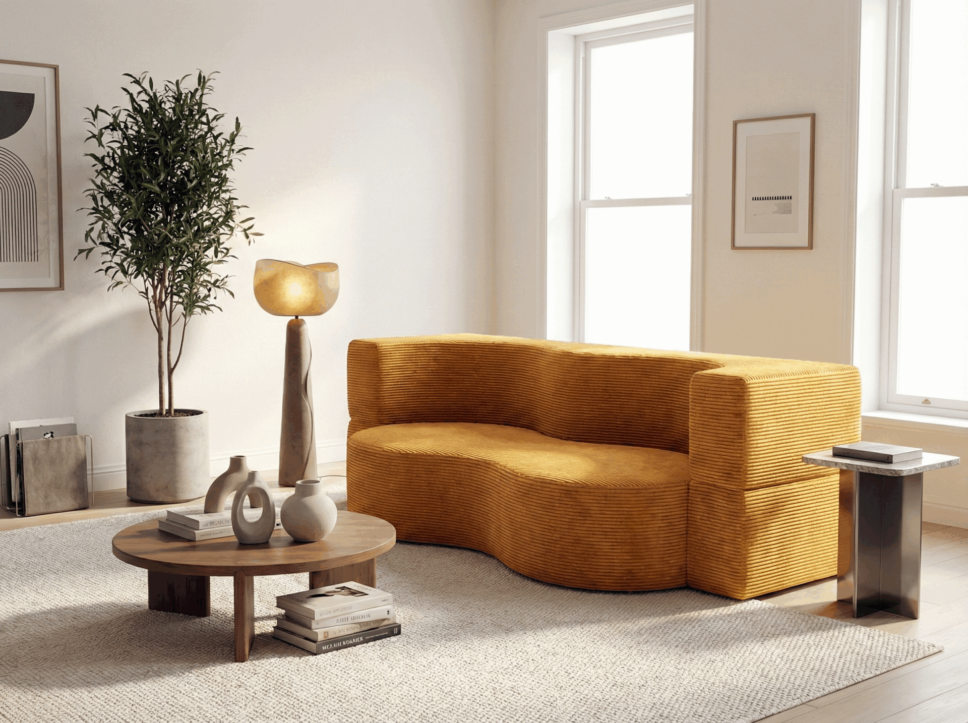 Sofa Arc została obita miękką, przyjemną w dotyku tkaniną sztruksową, której wyraźna struktura podkreśla jej nowoczesny charakter i nadaje całości ciepła. To materiał doskonale sprawdzający się w codziennym użytkowaniu, łatwy do dopasowania do różnych stylów wnętrz.