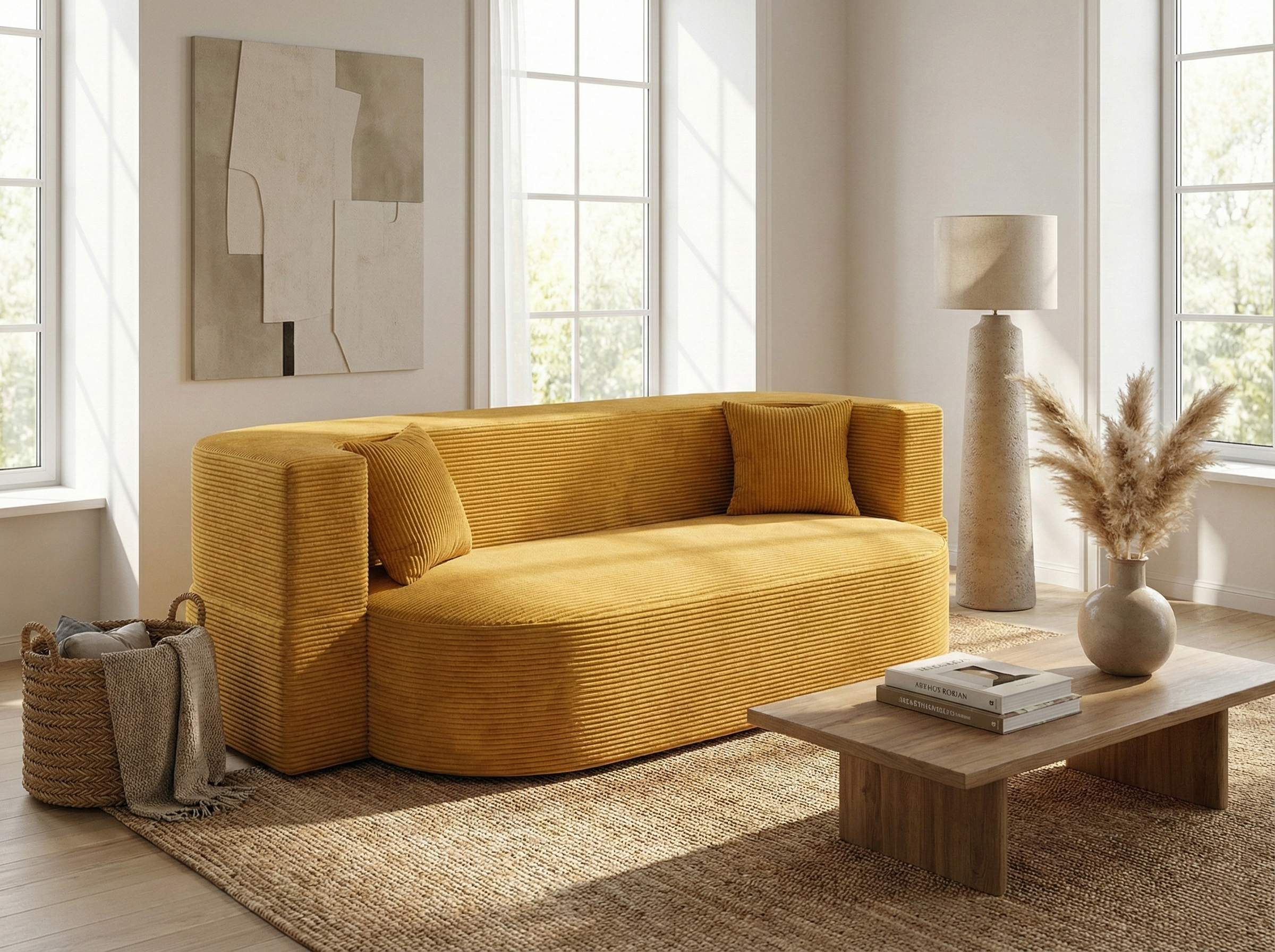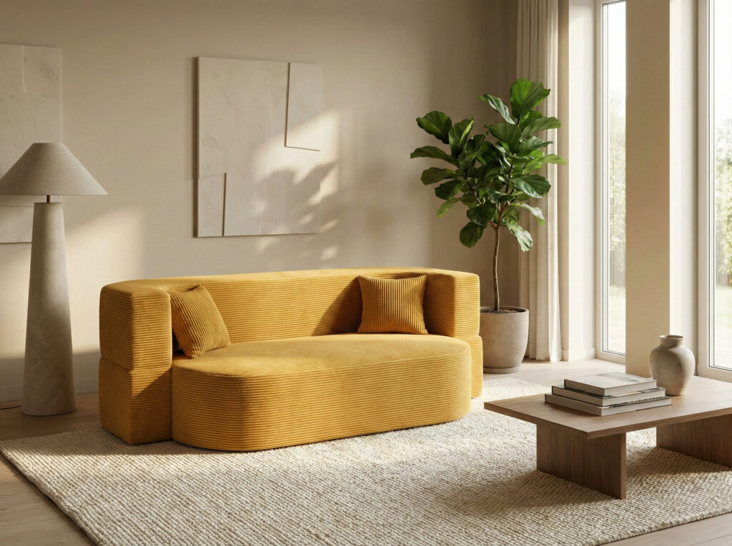 Sofa Ova oferuje również możliwość komfortowego wypoczynku w pozycji leżącej, zachowując jednolitą, minimalistyczną formę bez mechanizmów i podziałów. Sztruksowa tapicerka nadaje wnętrzu ciepła i podkreśla nowoczesny charakter mebla.