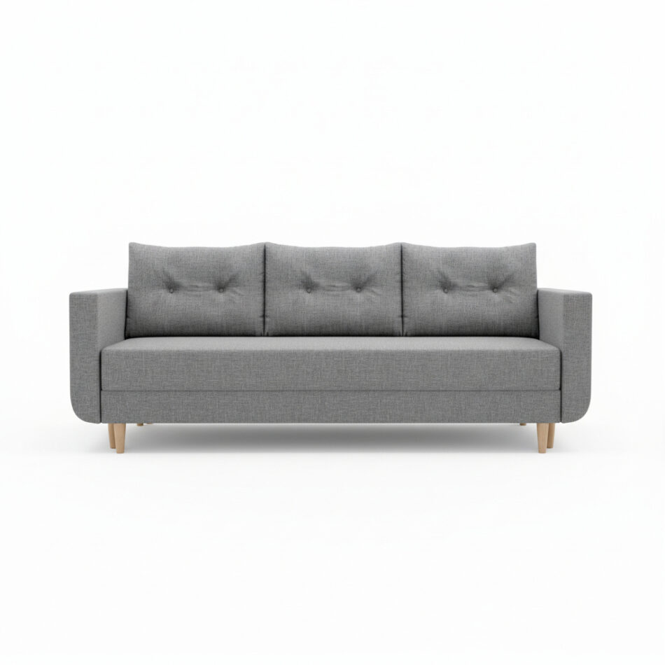 Delikatny, jasnoszary kolor tkaniny subtelnie rozjaśnia pomieszczenie i daje poczucie przestronności. Wysokie nóżki z drewna bukowego dodają konstrukcji wizualnej lekkości. Dzięki temu kanapa prezentuje się elegancko i zgrabnie. Co ważne, jej tył również został obity materiałem. W ten sposób mebel może stanąć w centralnym punkcie pokoju, doskonale organizując jego przestrzeń.