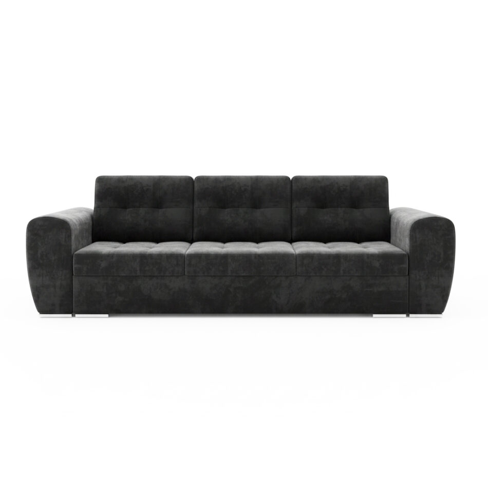 Jej ponadczasowy design z łatwością wpisuje się w aranżacje nowoczesne oraz klasyczne. Głęboki, grafitowy odcień tapicerki wprowadza do salonu atmosferę spokoju i elegancji. Stanowi on piękne tło dla kolorowych dodatków lub stonowanej palety barw. Dzięki temu mebel staje się uniwersalną bazą dla wystroju wnętrza. Całość osadzono na niskich, chromowanych nóżkach, które dodają konstrukcji wizualnej lekkości. Co ważne, tapicerowany tył pozwala na ustawienie kanapy w dowolnym miejscu, nawet na środku pokoju.