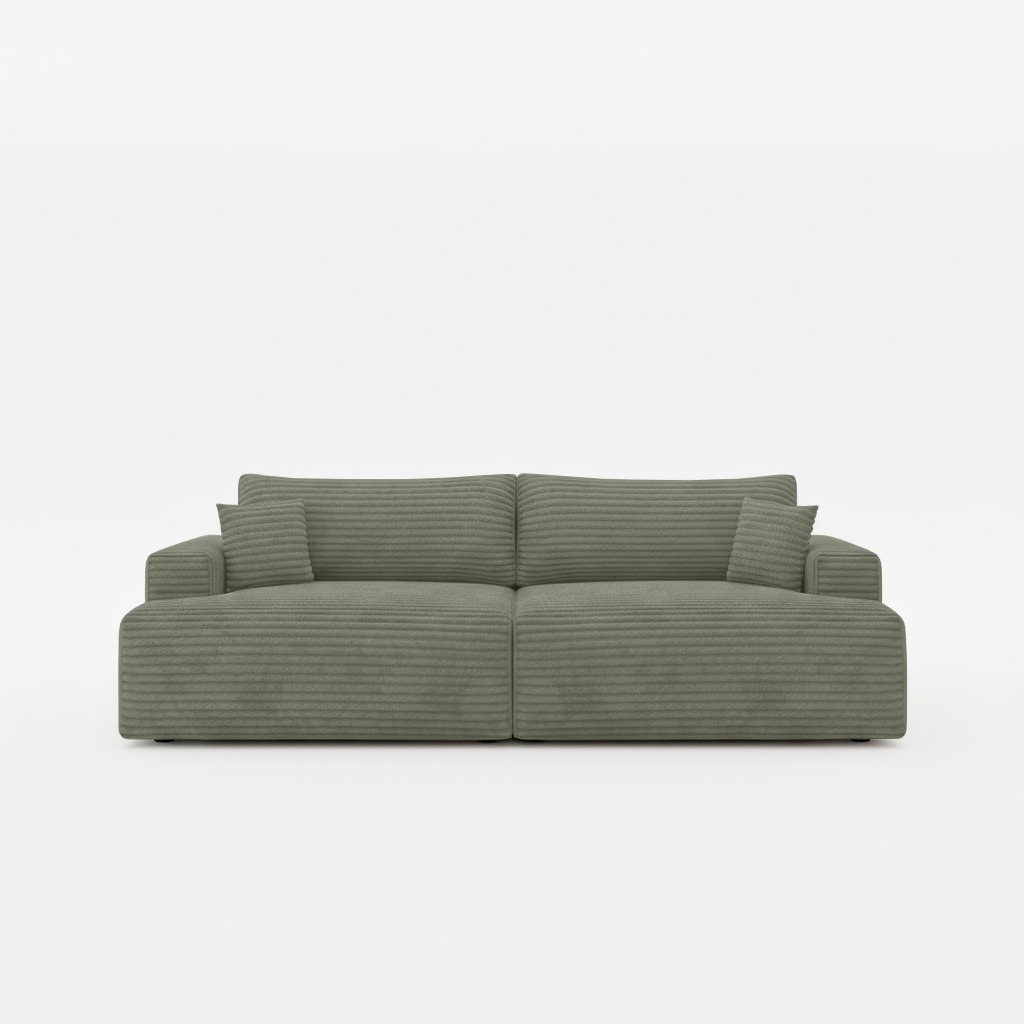 Jej prosty, ponadczasowy design z łatwością dopasuje się do wnętrz klasycznych oraz nowoczesnych. Głęboki, oliwkowy odcień tapicerki wprowadza do salonu atmosferę spokoju i bliskości z naturą. Kolor ten pięknie komponuje się z drewnem, bielą i odcieniami ziemi, tworząc przytulną przestrzeń do odpoczynku. Mięsista faktura sztruksu Poso dodaje całości elegancji i ciepła. Dzięki tapicerowanemu tyłowi kanapa może stanąć w dowolnym miejscu, nawet na środku pokoju.