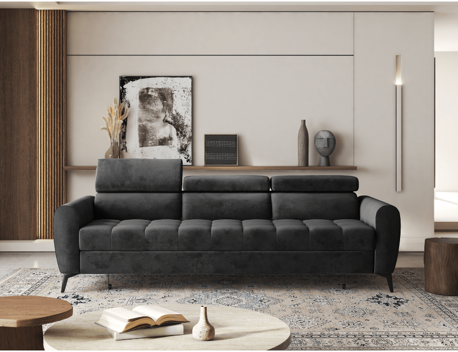 Jej prostą bryłę osadzono na wysokich, czarnych nóżkach. Nadaje jej to lekkości i ułatwia utrzymanie porządku pod meblem. Głęboki, ciemnoszary kolor tapicerki tworzy w pomieszczeniu atmosferę spokoju i wyrafinowania. Stanowi on doskonałą bazę dla aranżacji w stylu nowoczesnym lub boho. Co ważne, tapicerowany tył pozwala ustawić kanapę w dowolnym miejscu. Dzięki temu staje się ona centralnym punktem salonu.