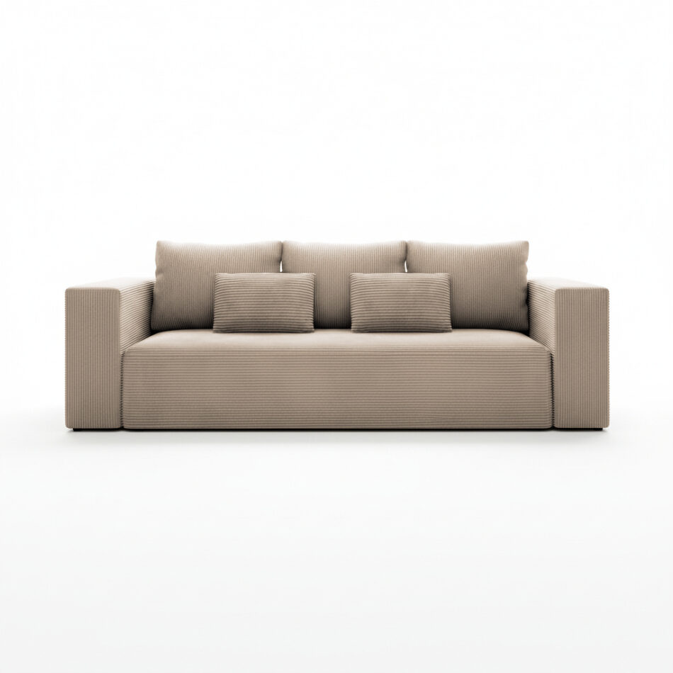 Delikatny beżowy odcień wprowadza do salonu atmosferę ciepła i spokoju. Dzięki temu staje się on idealnym tłem dla jasnych aranżacji skandynawskich lub przytulnych przestrzeni boho. Charakterystyczna faktura sztruksu sprawia, że kolor nabiera głębi i jest przyjemny w dotyku. Kanapa posiada tapicerowany tył. Pozwala to na ustawienie jej w dowolnym miejscu, nawet na środku pokoju.