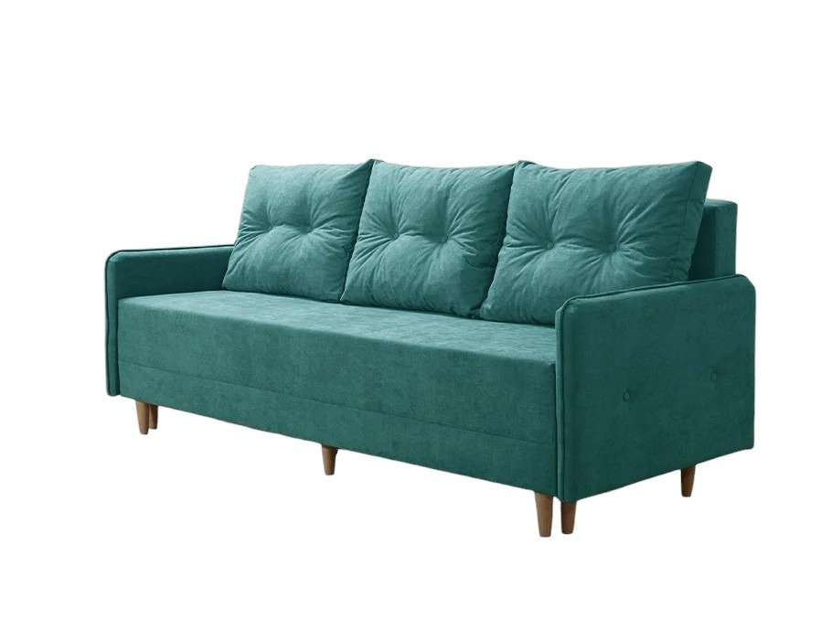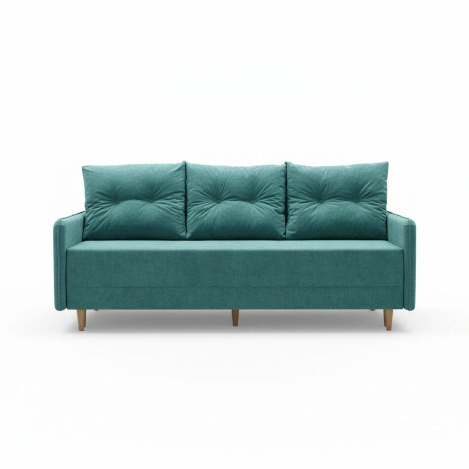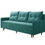 Prosta, geometryczna bryła zyskuje lekkość dzięki wysokim nóżkom. Wykonano je z naturalnego drewna bukowego, które wprowadza do wnętrza ciepły akcent. Głęboki turkusowy kolor tapicerki staje się wyrazistym elementem wystroju salonu. Wprowadza do aranżacji ożywczą atmosferę i świetnie komponuje się zarówno z nowoczesnym, jak i klasycznym stylem. Co ważne, tapicerowany tył mebla pozwala ustawić go w dowolnym miejscu pokoju, nie tylko przy ścianie.