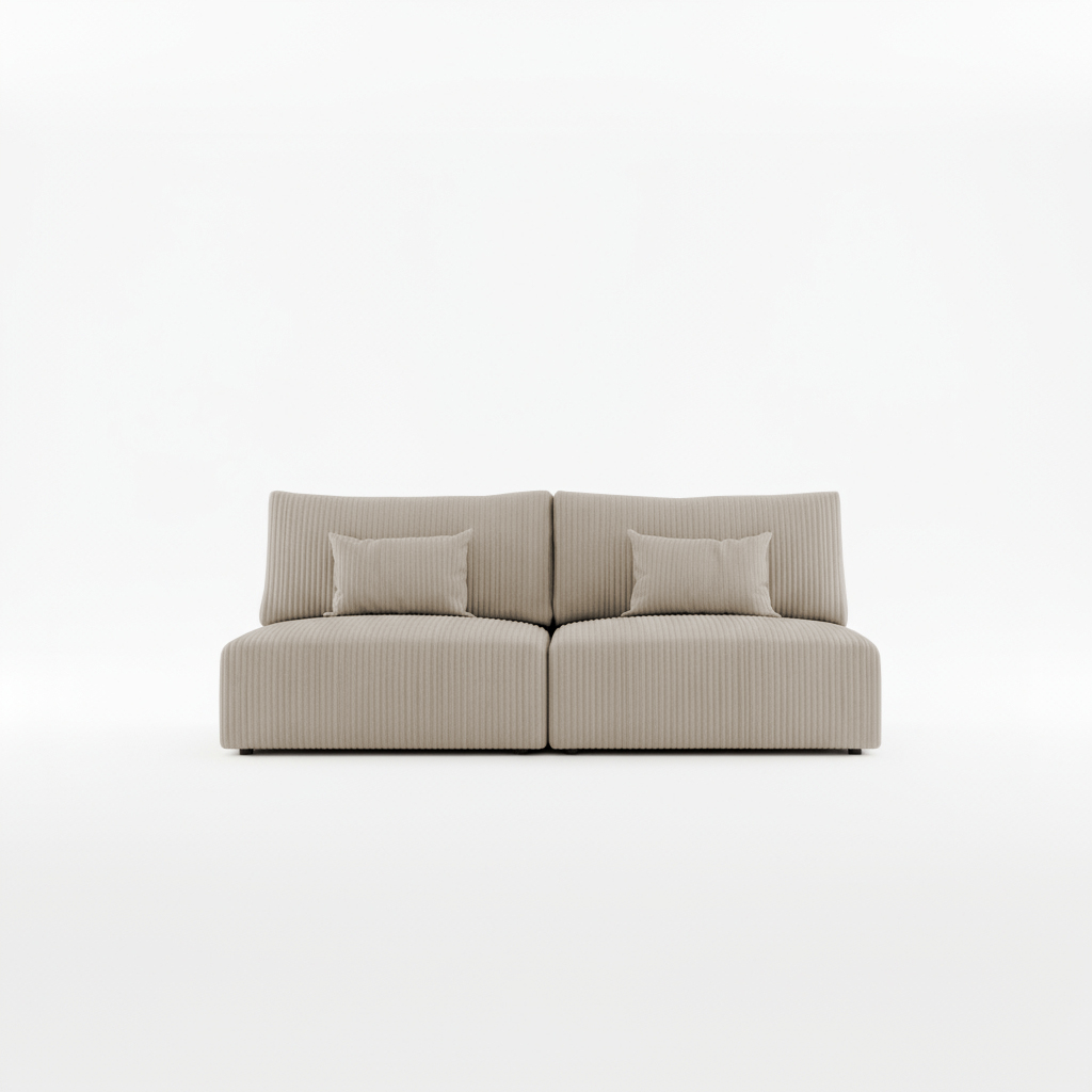 Jej prosty, geometryczny kształt doskonale wpisuje się we współczesne aranżacje. Jasny, beżowy odcień wprowadza do salonu atmosferę spokoju oraz ciepła. Dlatego kanapa stanowi idealną bazę dla wnętrz w stylu skandynawskim, minimalistycznym lub boho. Miła w dotyku faktura sztruksu zachęca do odpoczynku po długim dniu. Co ważne, mebel posiada tapicerowany tył. Dzięki temu można postawić go w dowolnym miejscu, nawet na środku pokoju.