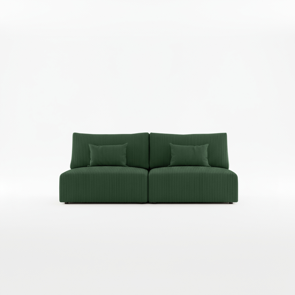 Jej prosta, geometryczna bryła doskonale wpisuje się w nowoczesne aranżacje. Głęboki odcień butelkowej zieleni nadaje salonowi elegancji oraz przytulności. Kolor ten pięknie komponuje się z drewnem lub metalowymi dodatkami w złotym kolorze. Charakterystyczna faktura sztruksu sprawia, że mebel jest niezwykle przyjemny w dotyku. Dzięki tapicerowanemu tyłowi kanapę można ustawić w dowolnym miejscu, czyniąc z niej centralny punkt każdego spotkania.