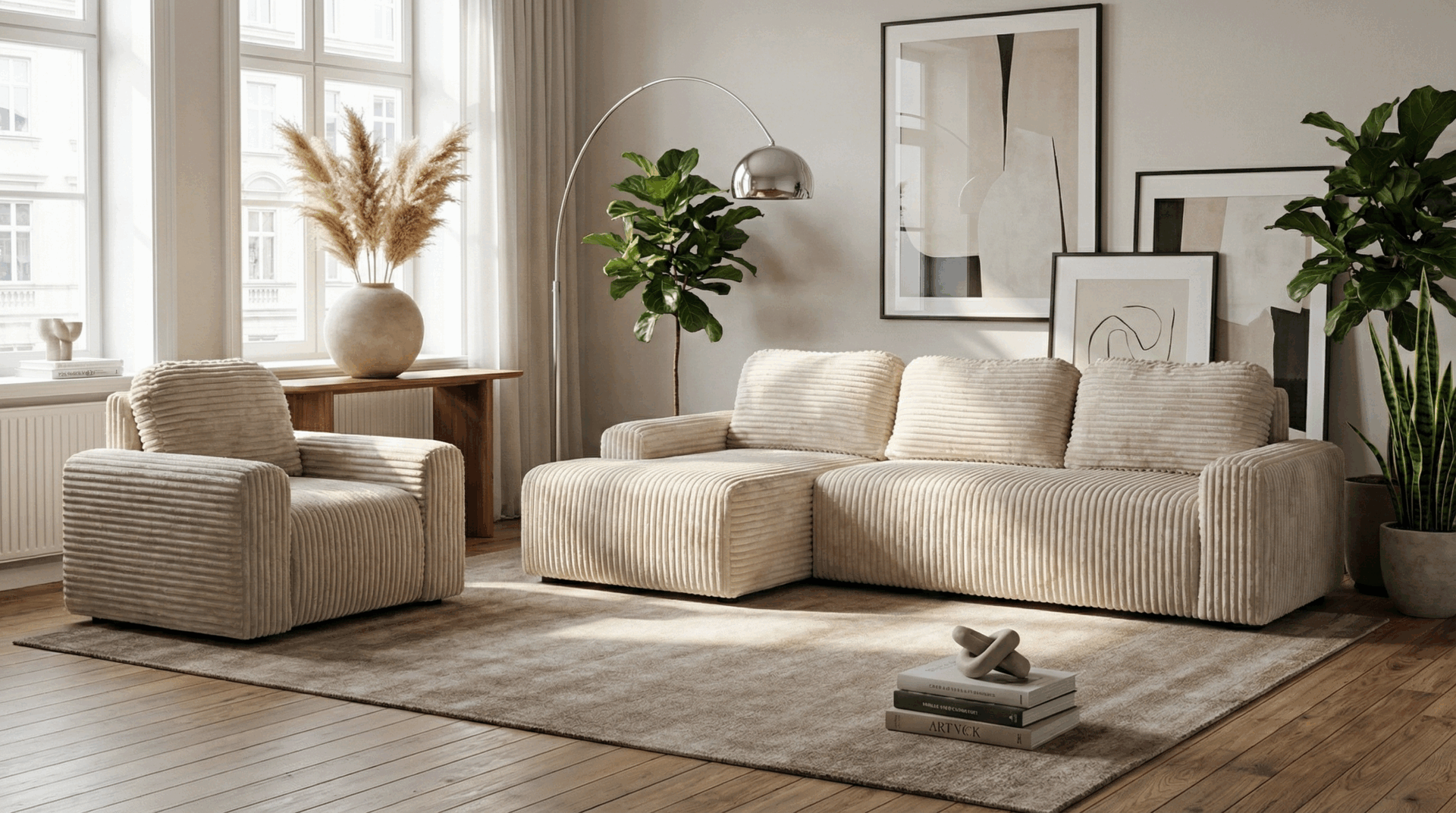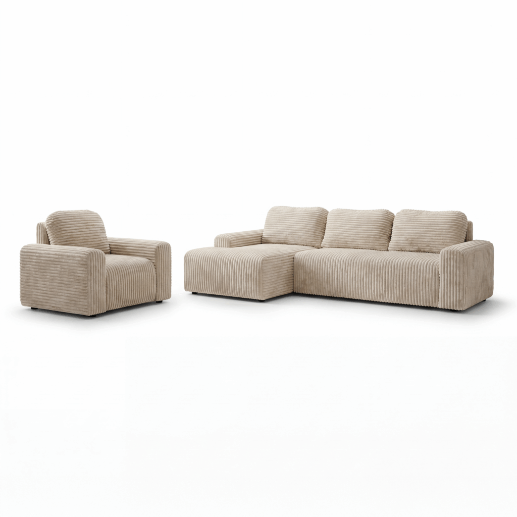 Komplet Nesso z narożnikiem lewostronnym i fotelem kremowy sztruks
