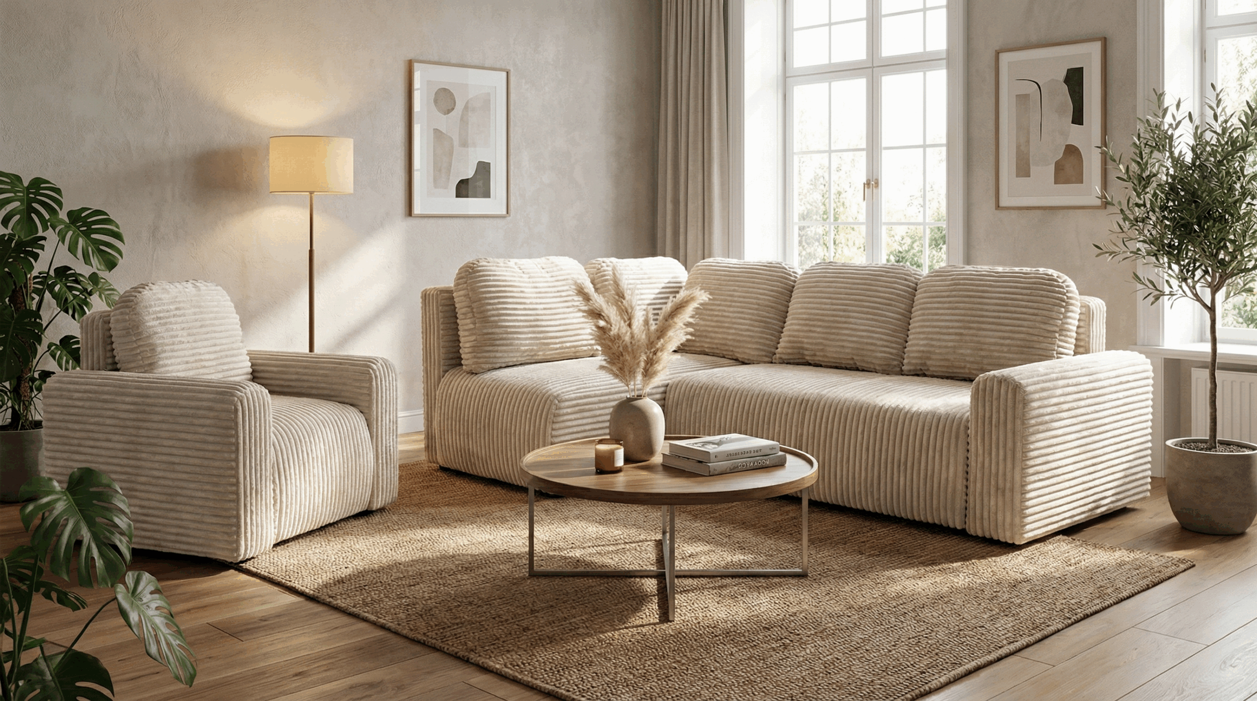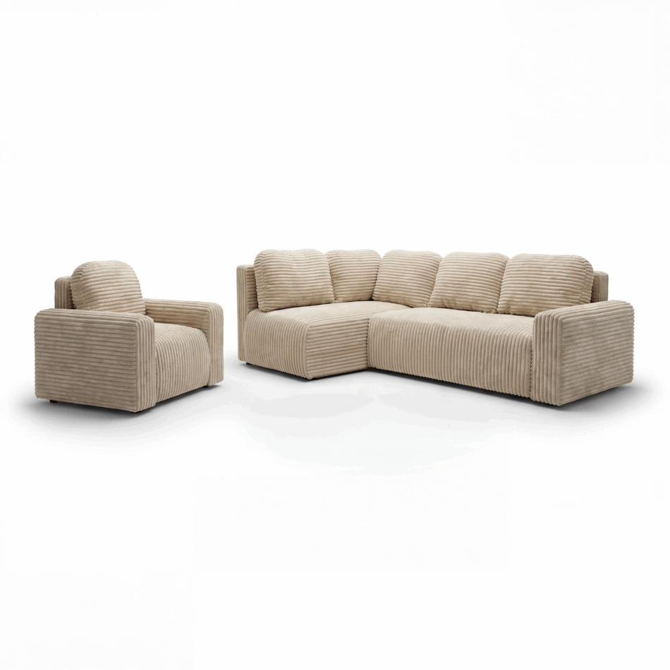 Całość obita jest przyjemną w dotyku tkaniną sztruksową, której wyrazista struktura nadaje meblom charakterystyczny, nowoczesny wygląd oraz podkreśla ich przytulny charakter. Prosta, geometryczna bryła zestawu sprawia, że łatwo dopasować go do różnych stylów wnętrzarskich.