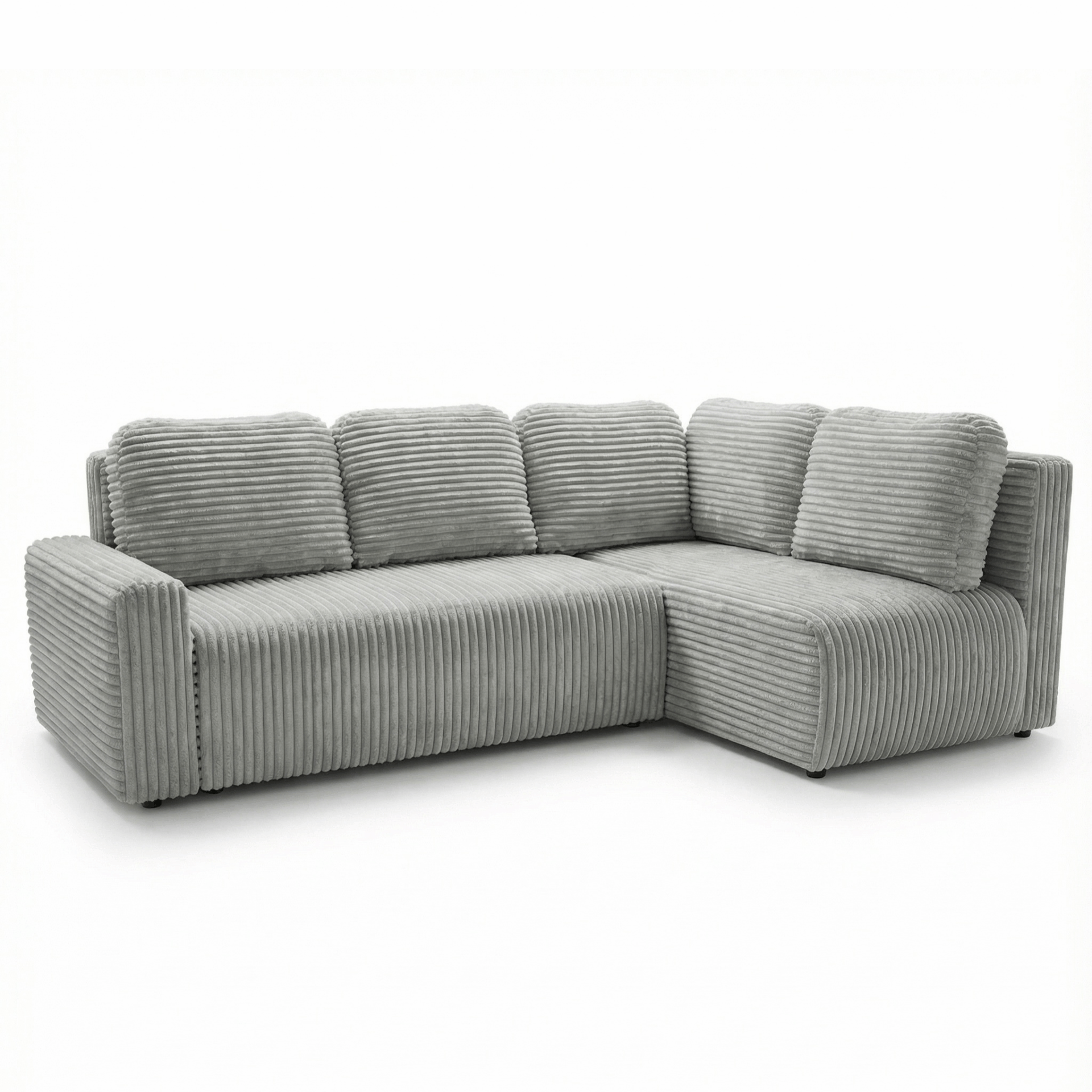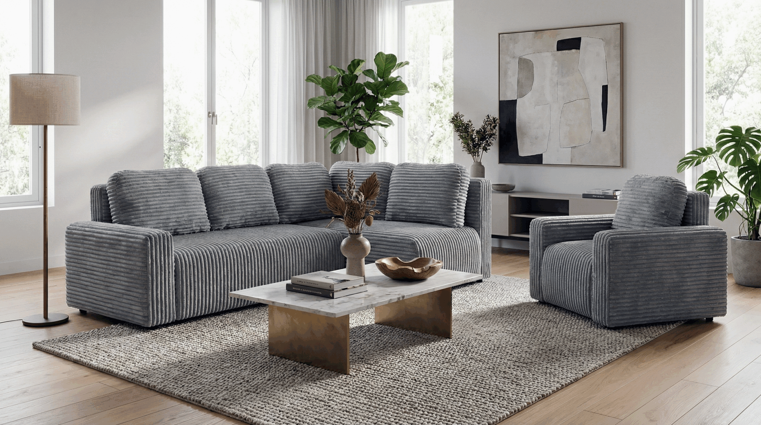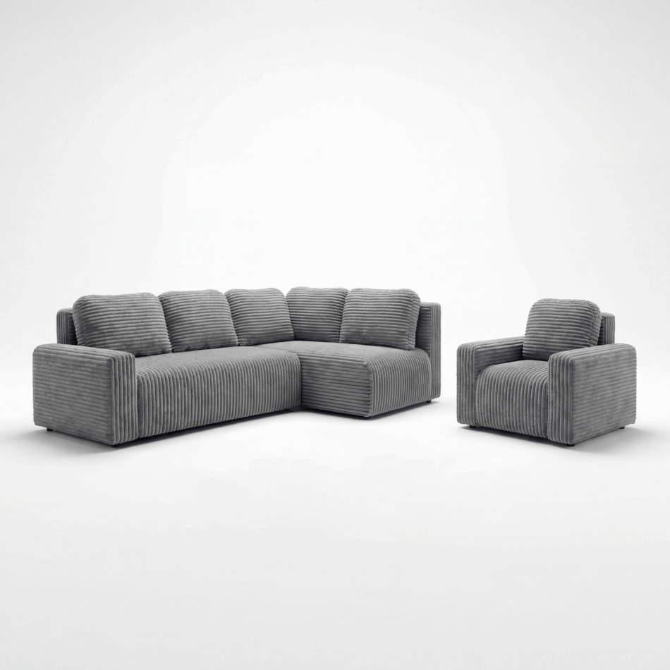 Całość obita jest przyjemną w dotyku tkaniną sztruksową, której wyrazista struktura nadaje meblom charakterystyczny, nowoczesny wygląd oraz podkreśla ich przytulny charakter. Prosta, geometryczna bryła zestawu sprawia, że łatwo dopasować go do różnych stylów wnętrzarskich.