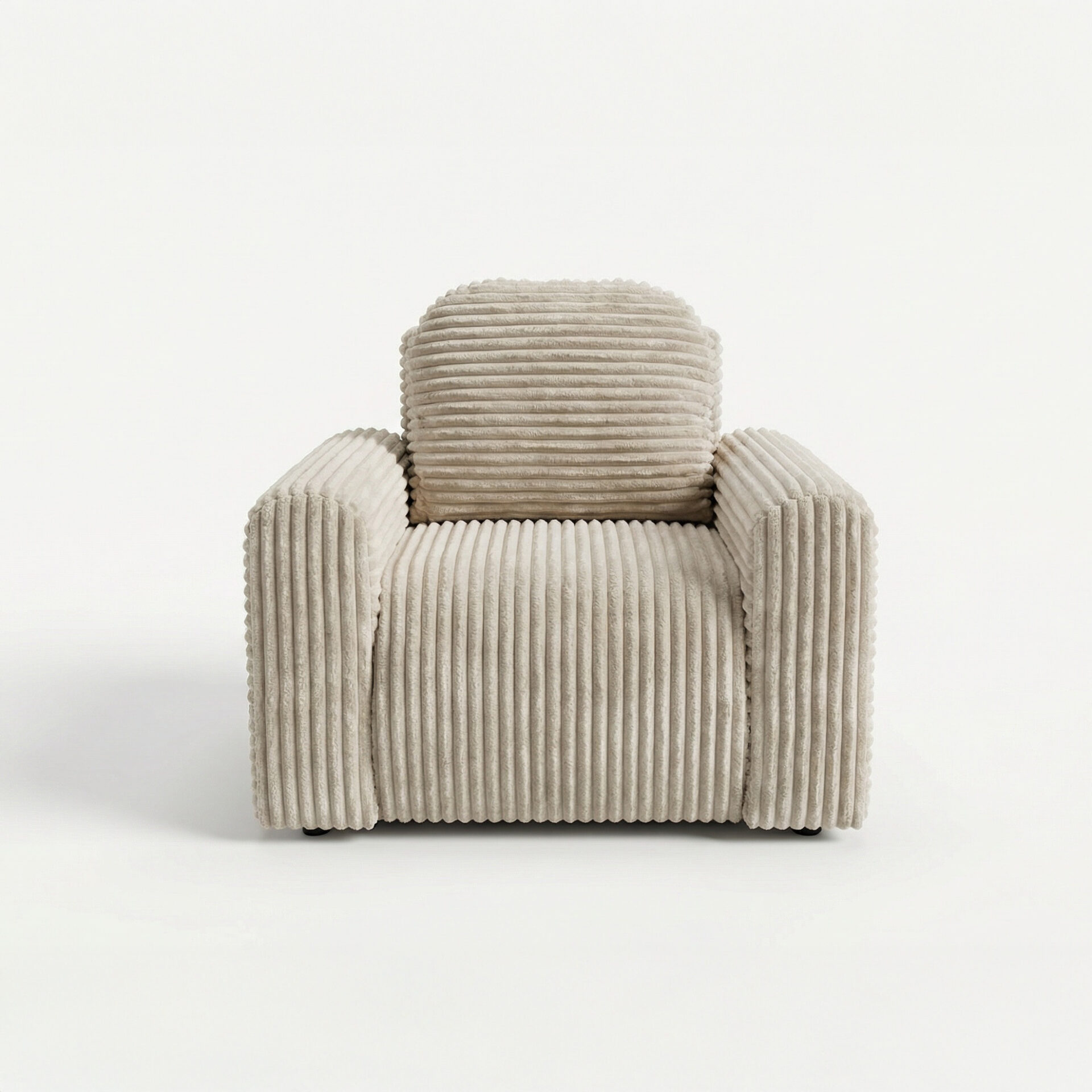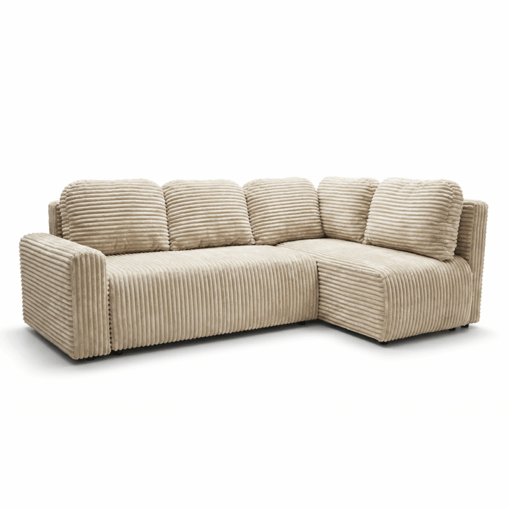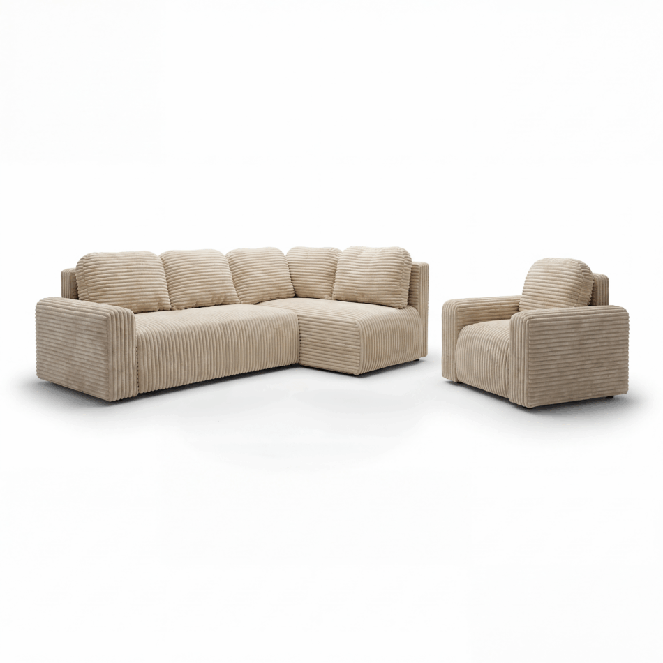Całość obita jest przyjemną w dotyku tkaniną sztruksową, której wyrazista struktura nadaje meblom charakterystyczny, nowoczesny wygląd oraz podkreśla ich przytulny charakter. Prosta, geometryczna bryła zestawu sprawia, że łatwo dopasować go do różnych stylów wnętrzarskich.