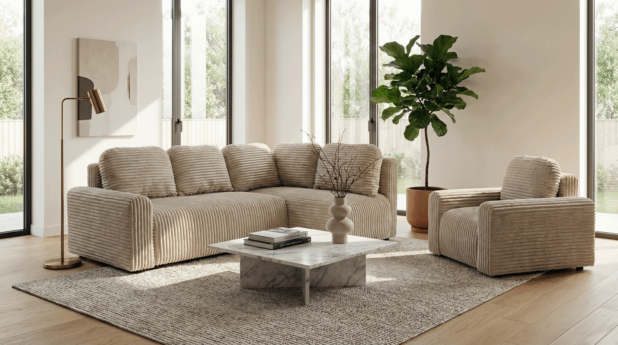 Zestaw wypoczynkowy Nesso L z narożnikiem prawostronnym i fotelem kremowy sztruks